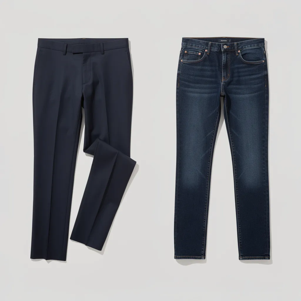 - Джинсы (преимущественно в рокабилли): Тёмные, сырые деним, узкого прямого кроя, часто подвёрнутые.