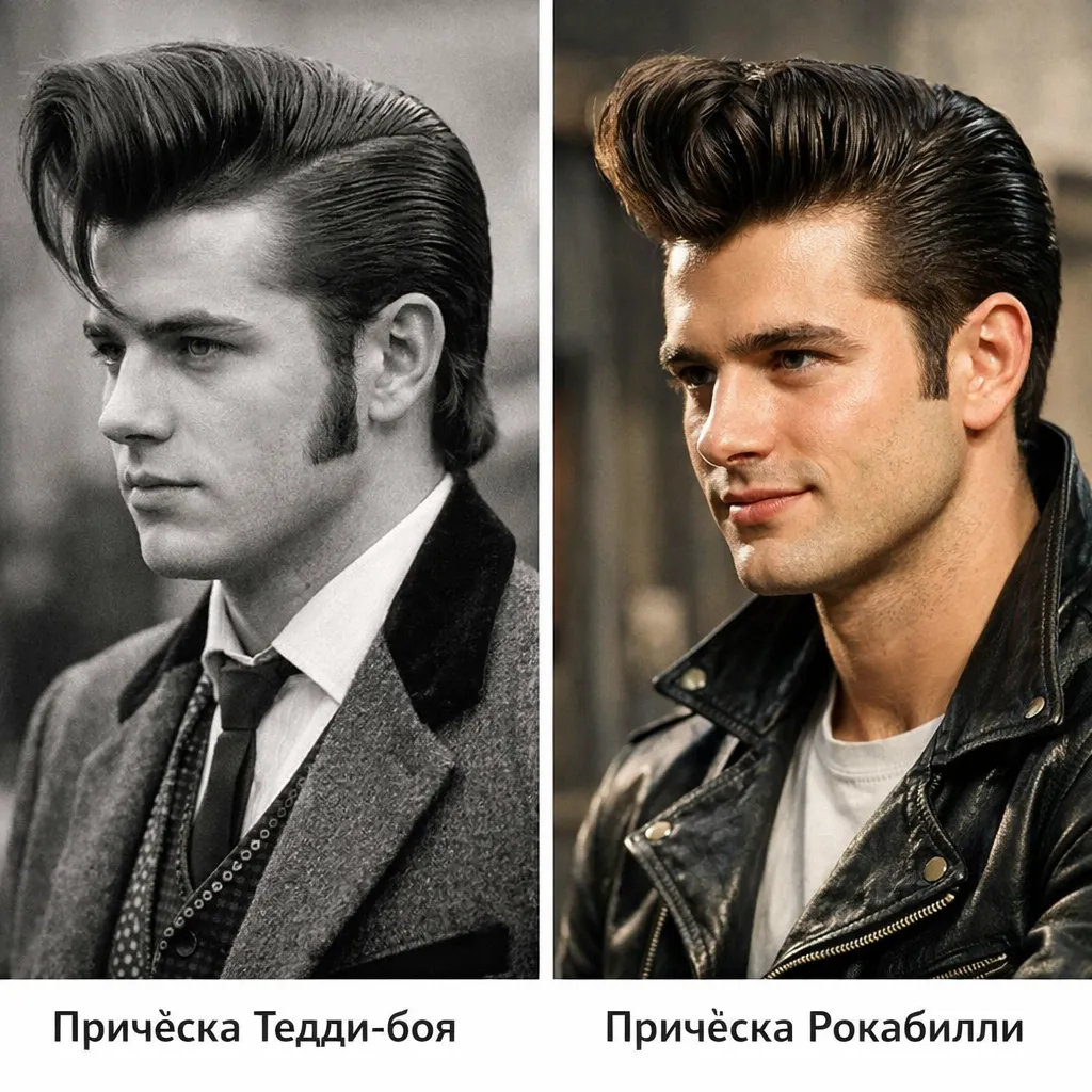 - Причёска Рокабилли: Более высокая, вздыбленная версия кока (pompadour), часто с более дикими, «засаленными» волосами (с использованием бриолина). Могли встречаться и залихватские зачёсы «а-ля Элвис».