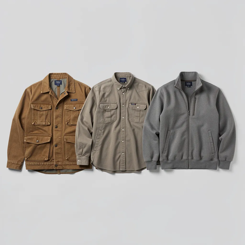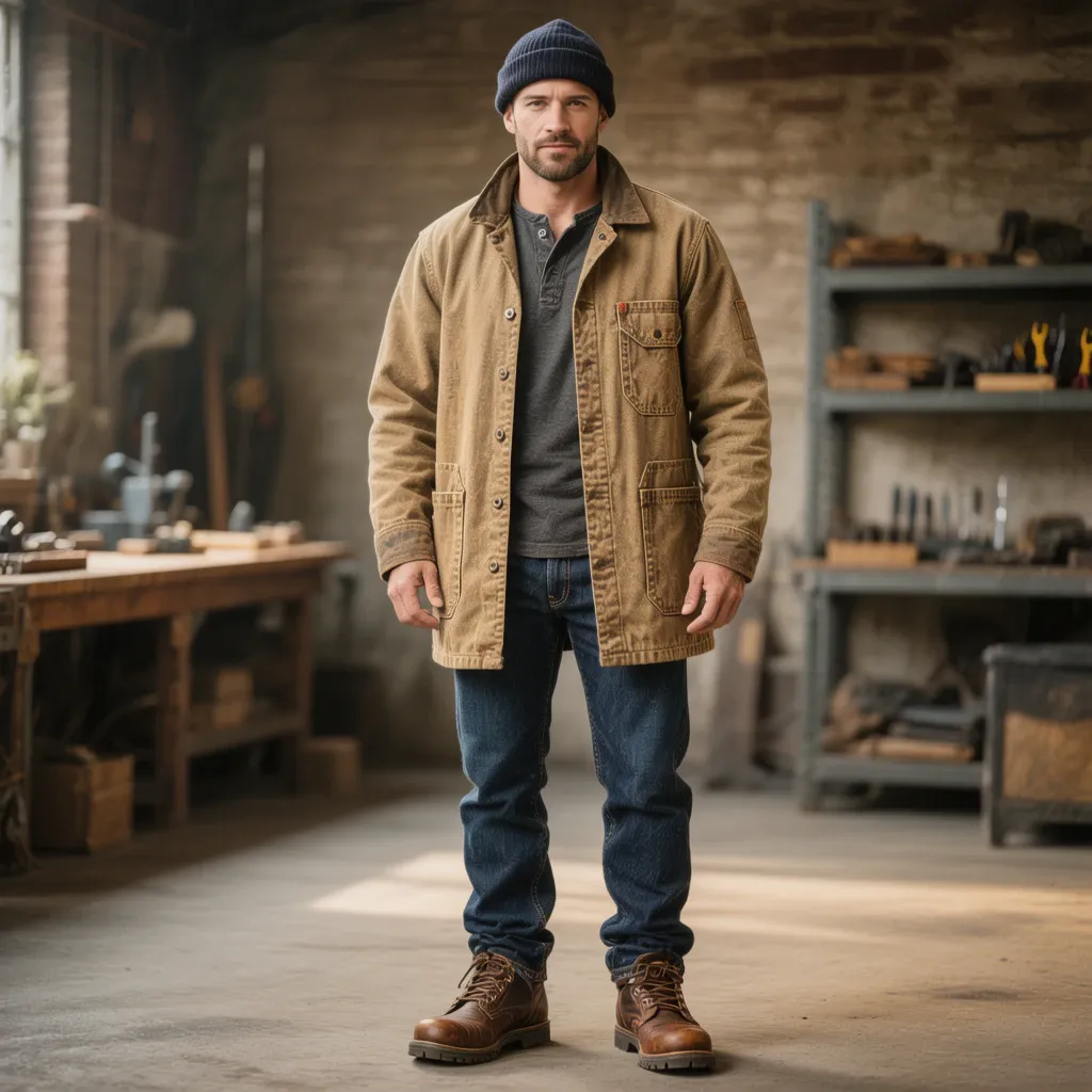 - Рабочая куртка из холста (Chore Coat / Work Jacket): Чаще из коричневого или синего холста. Множество карманов, металлические пуговицы. Бренды: Carhartt Detroit Jacket, Levi's Trucker (в дениме).