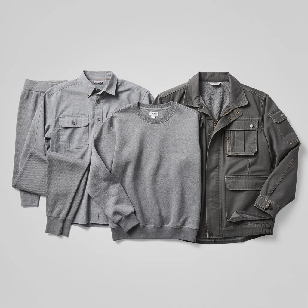 - Слоёность (Layering). Workwear создан для этого: термобелье + рабочая рубашка + свитшот + куртка. Каждый слой функционален и виден.