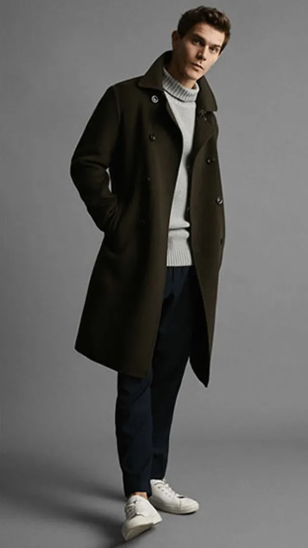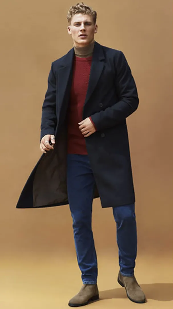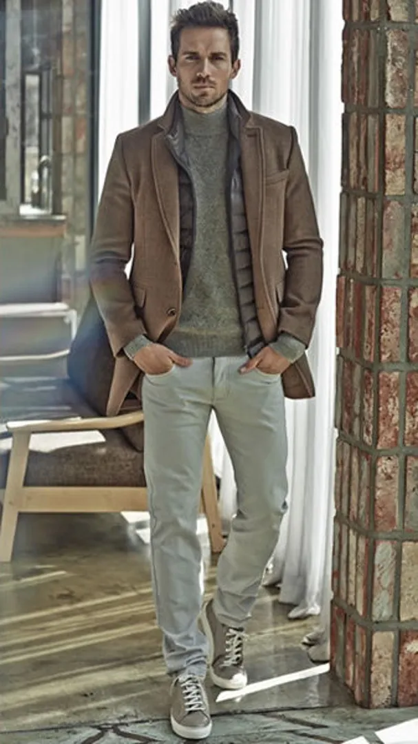 Для стилизации своего наряда дополните комбинацию джемпера с пальто с помощью шерстяных брюк и кожаных ботинок или для повседневной одежды брюками чинос и кроссовками, чтобы выглядеть достаточно раскрепощенно.