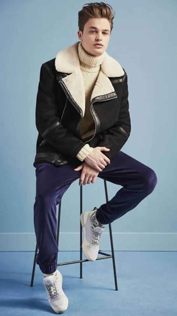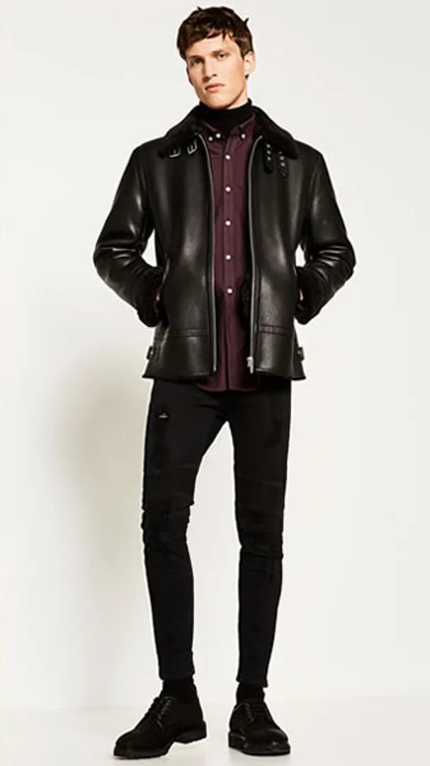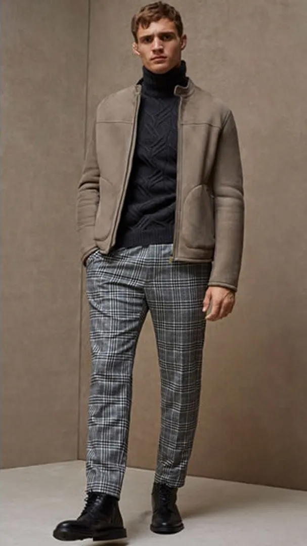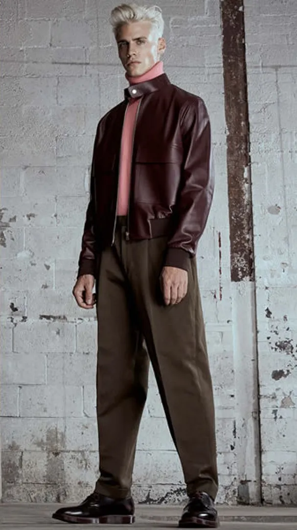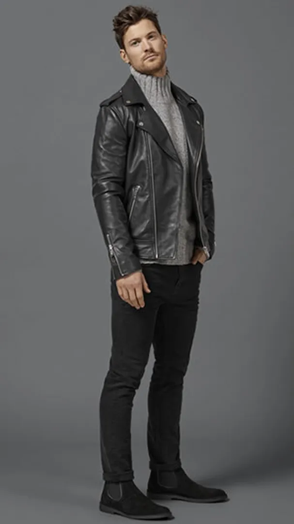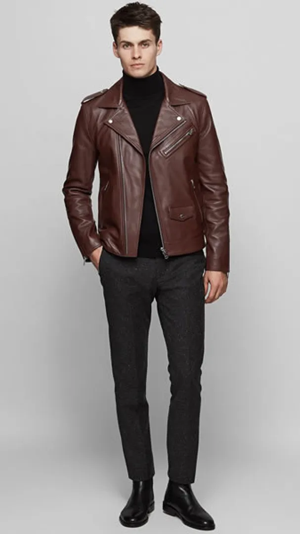 Чтобы еще больше повысить уровень тестостерона, наденьте под кожаную куртку джемпер с воротником-стойкой средней или толстой вязки и сшитые на заказ брюки, чтобы можно было соответствовать повседневной деловой форме в офисе или надев джинсы отправиться на выходные.