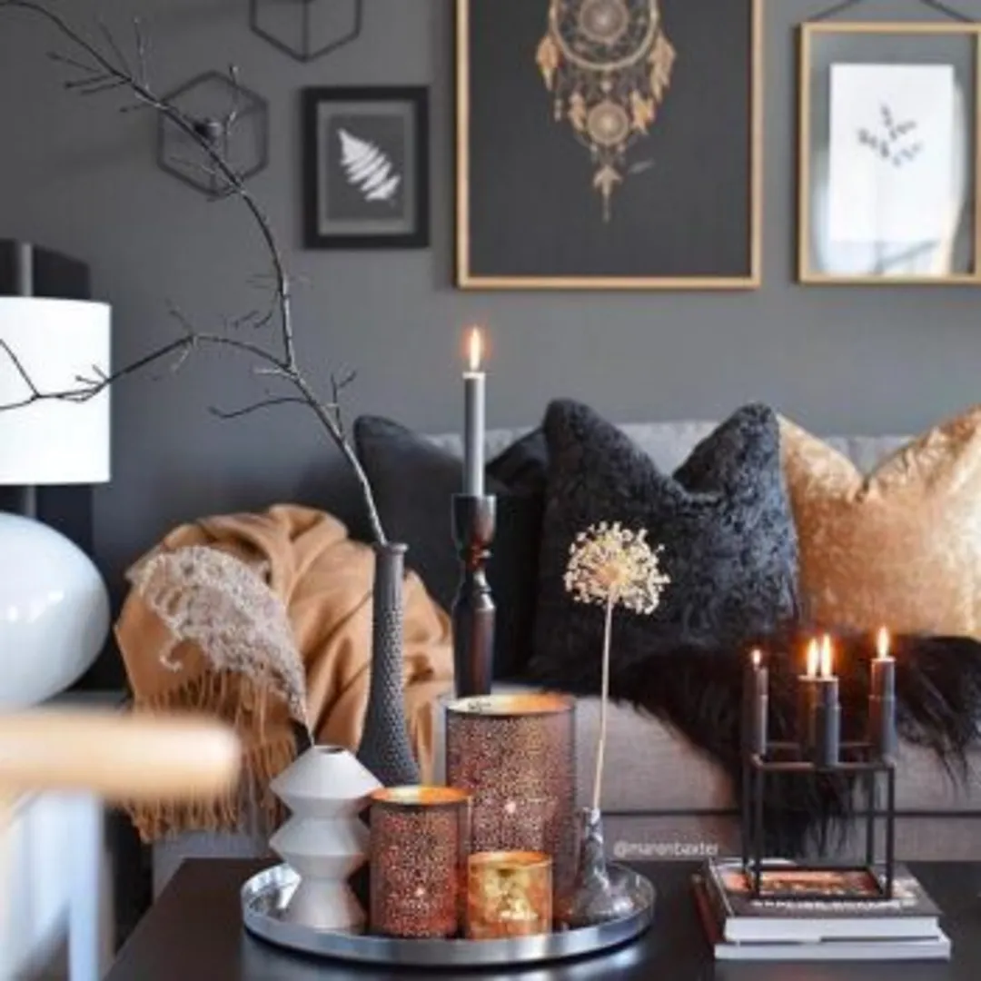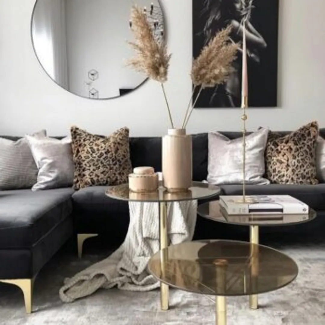Нашли столик с потрясающими металлическими ножками, но в неподходящей отделке? Достаточно нанести пару слоев аэрозольной краски, чтобы он гармонично вписался в остальной интерьер. Чтобы еще больше усилить эффект, загляните в эконом-магазины, антикварные лавки и на блошиные рынки и найдите там богато украшенные золотые зеркала или рамы для картин. Не важно, повесите ли вы их на стену или прислоните к стене, они прекрасно украсят вашу серую гостиную и придадут ей особый шарм.
