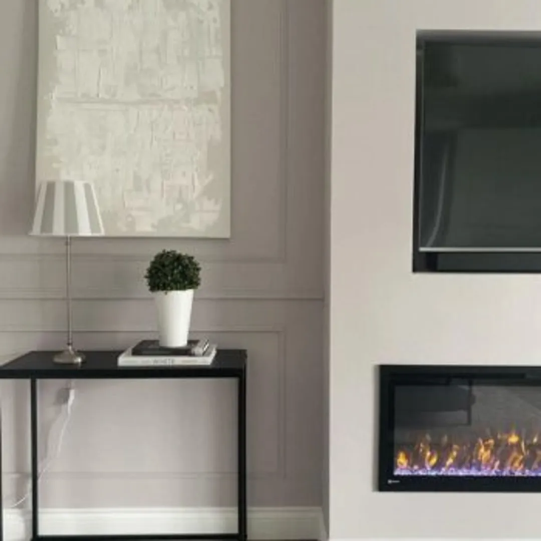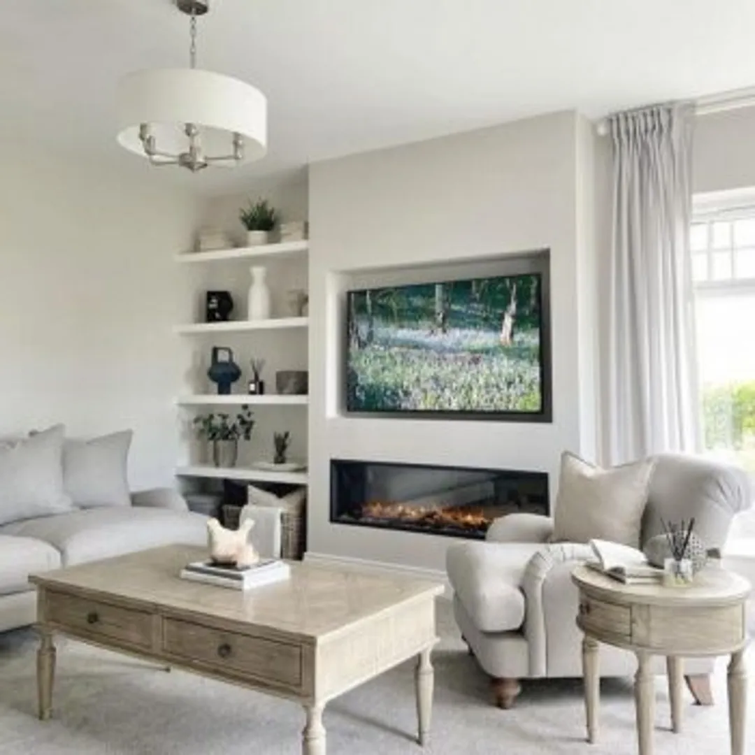 Если земляные нотки вам не по душе, попробуйте выбрать камин с чистыми линиями, скорее геометрическими, чем органичными. Это полностью изменит ощущение от камина и придаст вашей гостиной шикарный, современный вид. Серый камин служит отличной фокусной точкой для полностью белой комнаты, особенно если вы хотите отключиться от интернета и направить внимание не на телевизор.