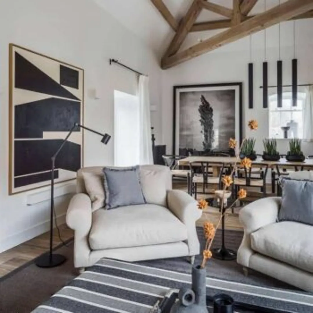Чтобы подчеркнуть стильный вид, подберите мебель с чистыми, прямыми линиями, а общий дизайн гостиной сделайте минимальным. Хотя полностью нейтральная комната всегда смотрится выигрышно, вы сможете добавить немного энергии с помощью ярких оттенков, таких как кобальт или неоновый оранжевый. Причудливые абстрактные художественные принты и броские геометрические светильники – дополнительные шикарные и изысканные элементы, способные придать помещению теплоту и индивидуальность.