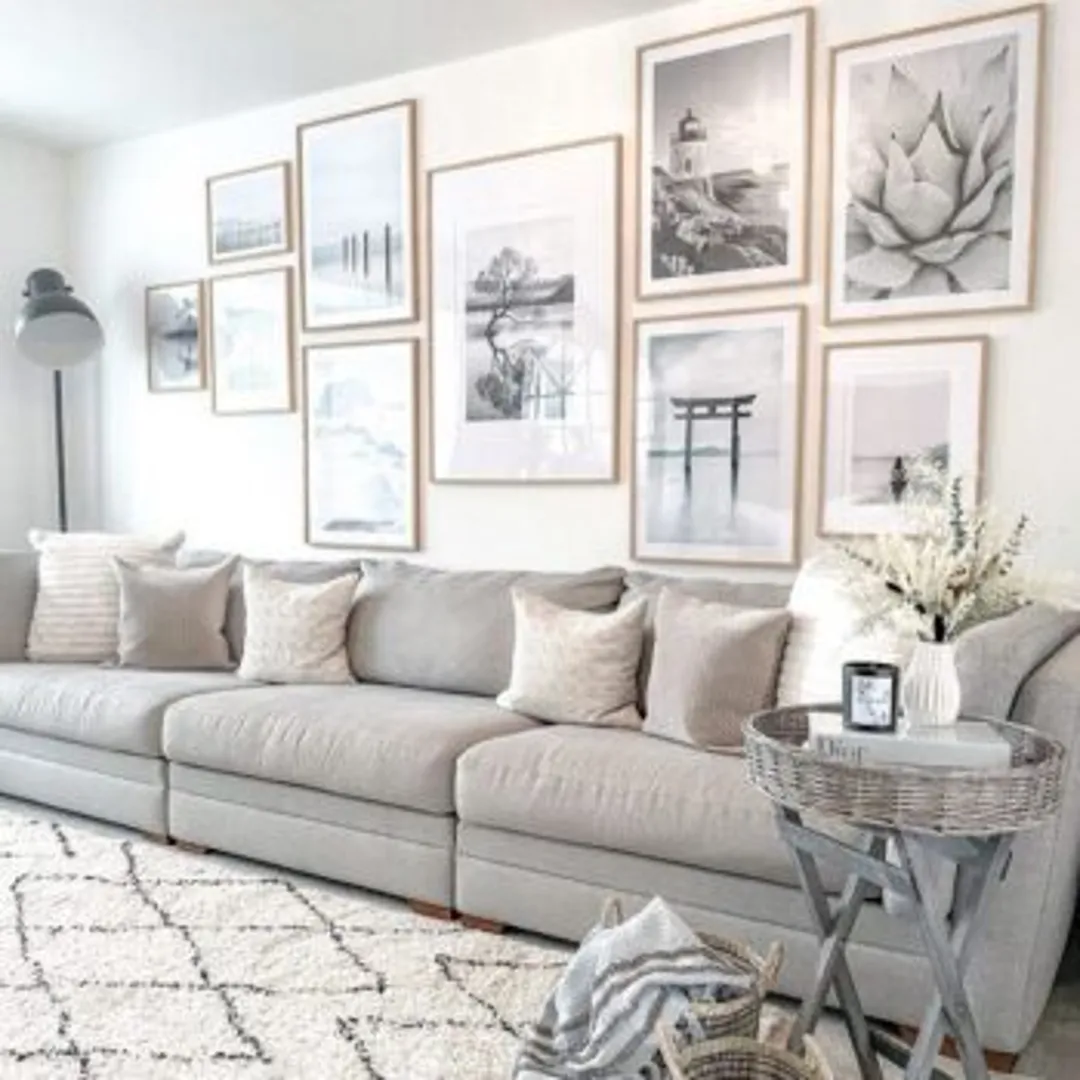 Если вы не знаете, как украсить обычные серые стены, не волнуйтесь. Разместите постеры, картины и фотографии так, чтобы получилась стена-галерея. Во избежание хаоса и для поддержания минималистской эстетики убедитесь, что фотографии объединены какой-то общей темой. Похожие рамки, цветовые схемы или сюжеты свяжут их воедино, создавая ощущение многослойности и целостности общего дизайна.