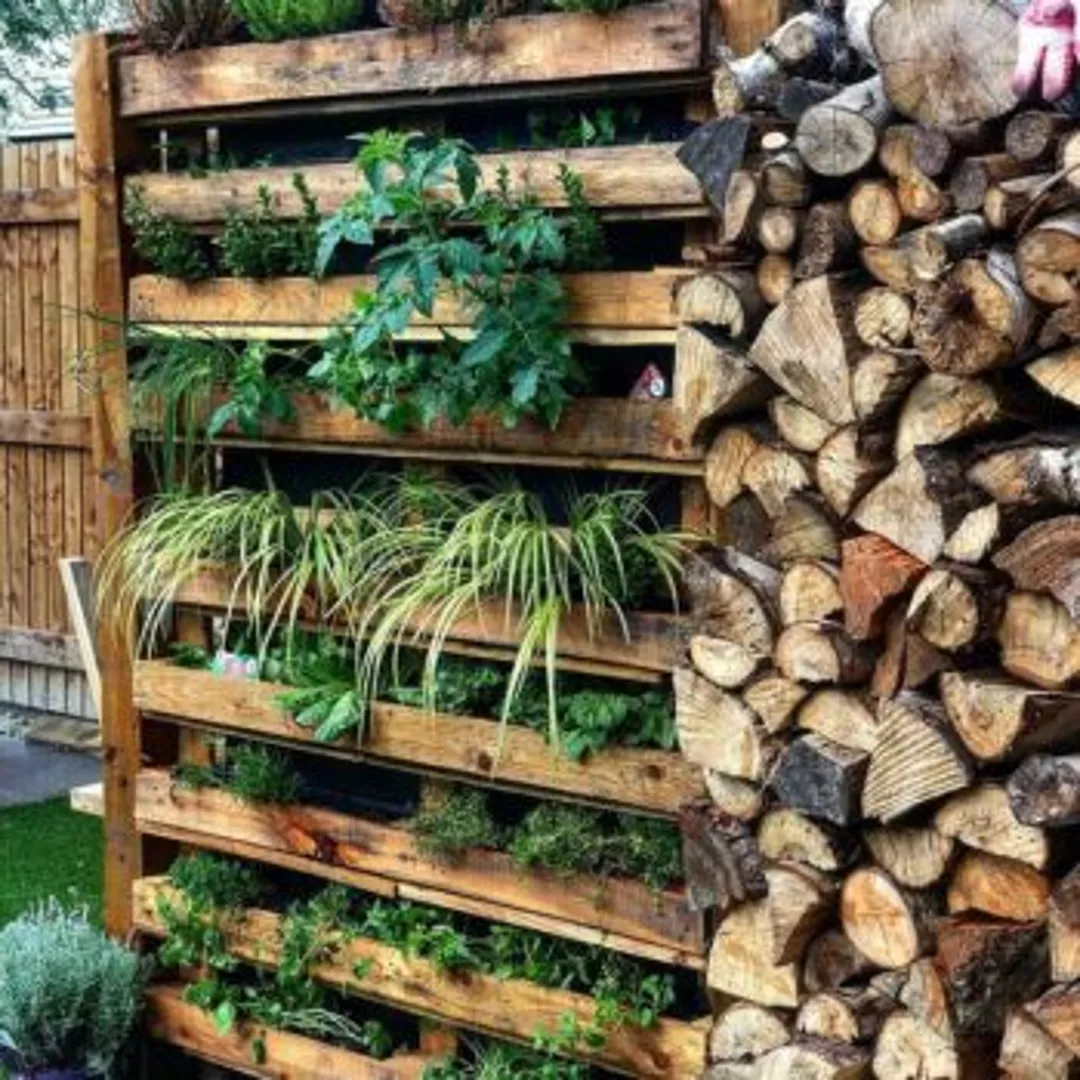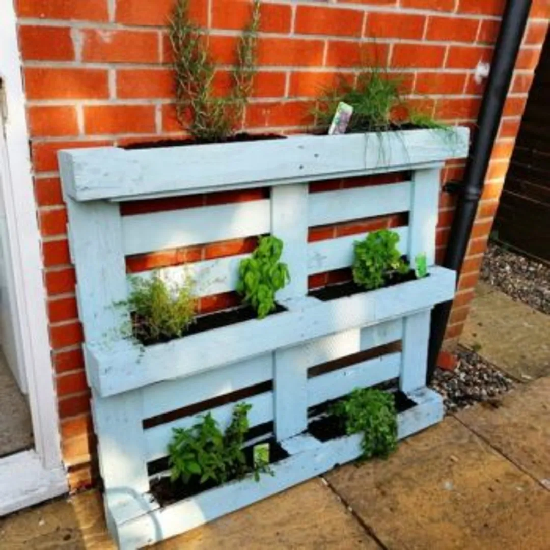 Использование поддонов в дизайне очень популярно и тому есть объяснение. Их легко поставить на бок, тем самым закрыть пустоты, превратить их в идеальное место для выращивания мелких травянистых растений. Необходимо перекрыть нижнюю часть пустот, чтобы почва не проваливалась. Поддоны хороши тем, что вы можете видоизменить их под своё пространство. Вы можете их покрасить, украсить или оставить просто деревянными.