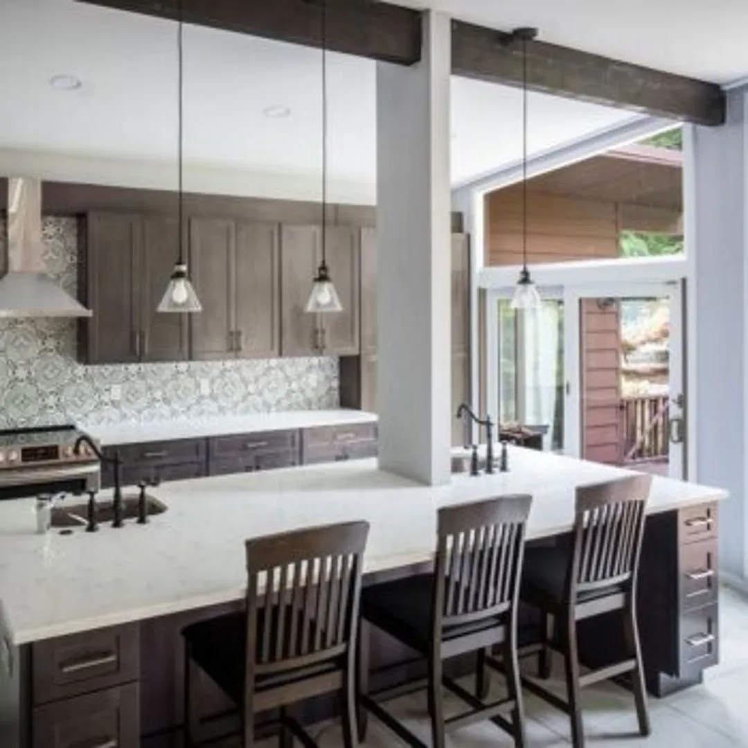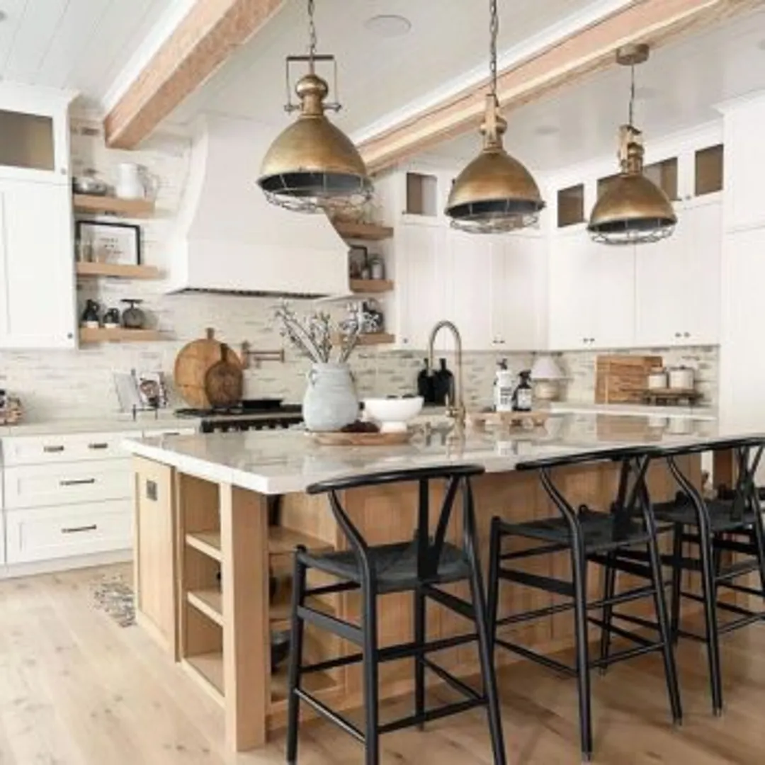 Отдайте предпочтение барным стульям с деревянными сиденьями и спинками или светильникам с деревянными деталями. Можно покрыть деревом пол. Внести черты стиля кантри можно с помощью декоративных деревянных балок на потолке.