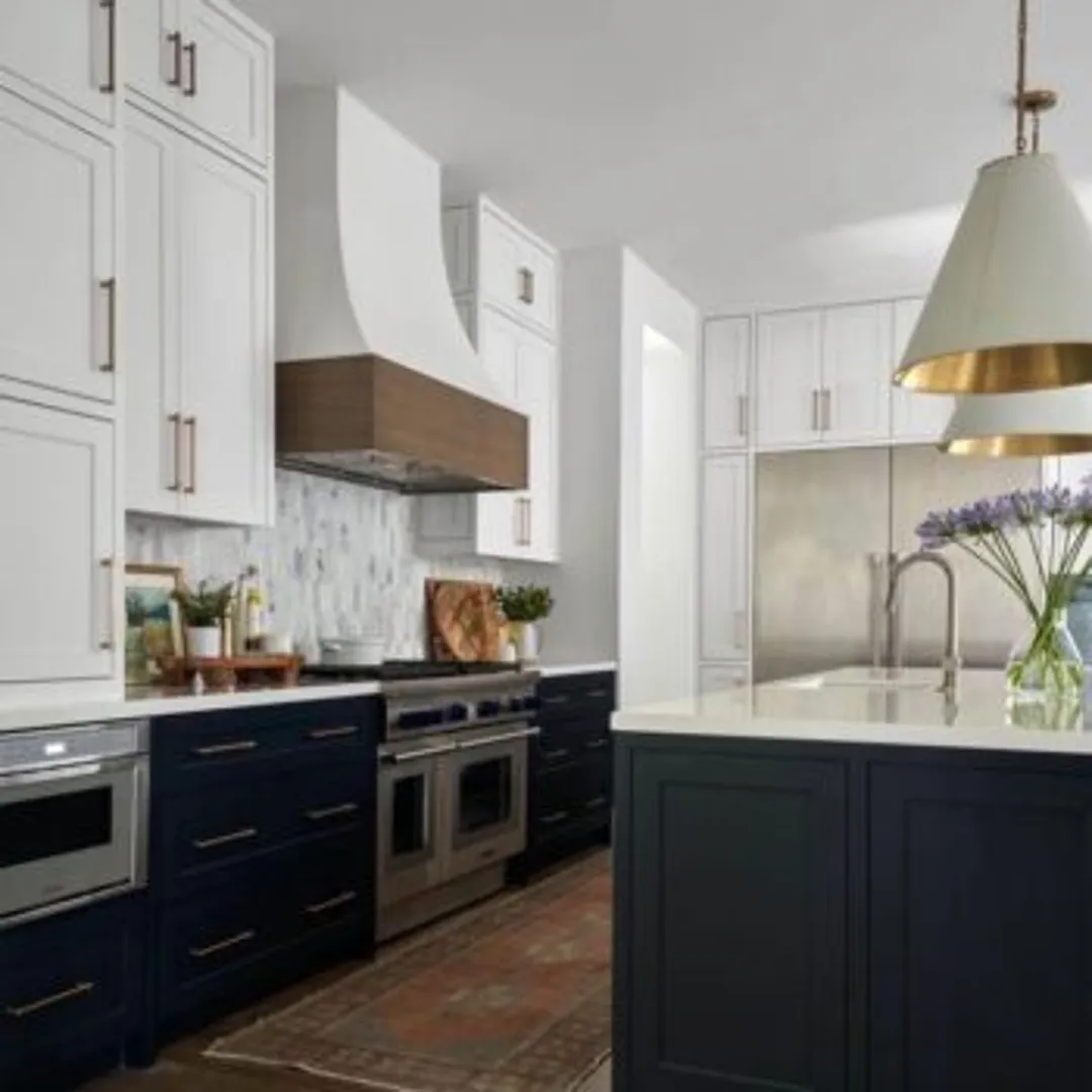 Один из модных приемов – покраска нижних шкафов. Для этого возьмите насыщенный темно-синий. Верхние шкафы оставьте белыми и дополните образ предметами из меди.