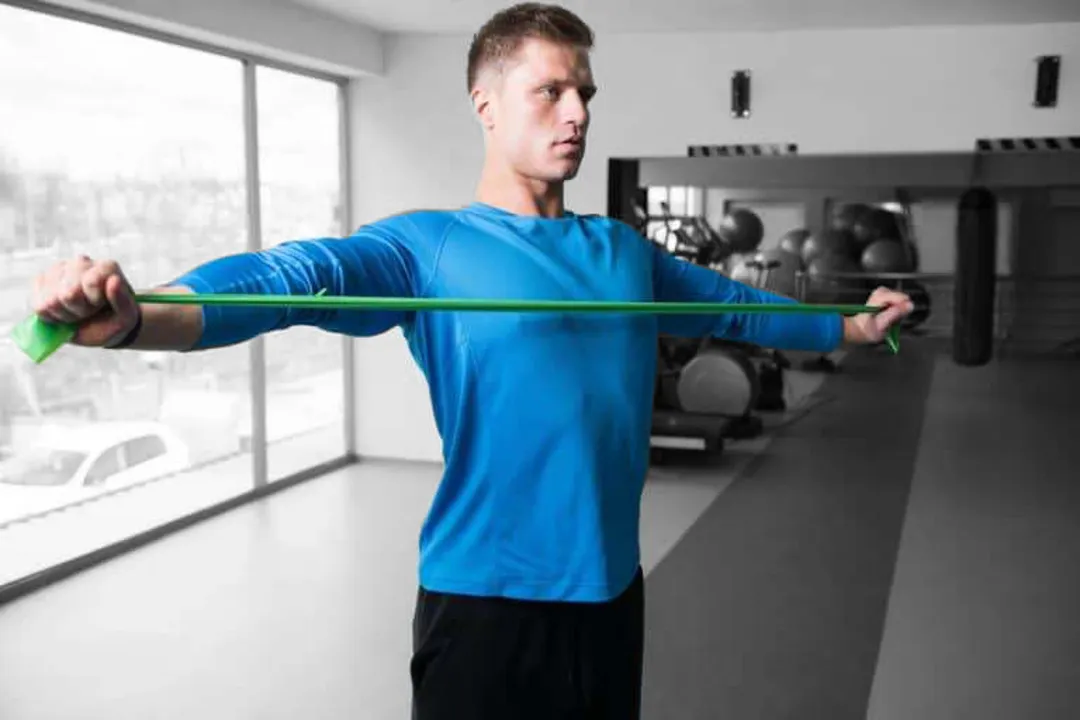 Держите ленту для упражнений перед собой, руки полностью вытянутые. Убедитесь, что они на ширине плеч. Разведите концы ленты в стороны, одновременно сводя лопатки ближе друг к другу. Растягивайте ленту, пока она не коснется груди. Затем медленно верните руки в исходное положение. Повторите действия.