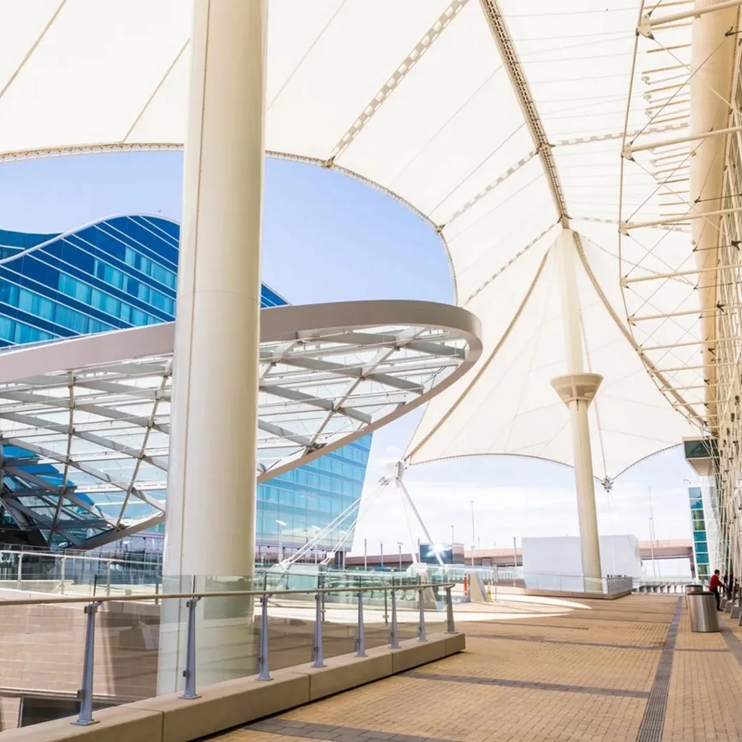 Видите, этот свет? Это одна из отличительных особенностей аэропорта Денвера, спроектированного архитектором Кертисом Френтиссом, который, благодаря умелому использованию тефлоновых занавесок, создал удивительный экстерьер, бесспорно живописный по сравнению с обычными аэропортами.