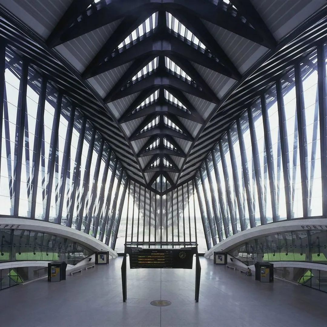 Еще одна работа Сантьяго Калатравы, чётко обозначившего свой «фирменный стиль», когда речь идёт об аэропортах. Как и в испанском Бильбао, форма лионского аэропорта имитирует полет птицы.