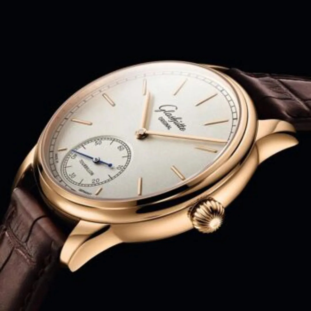 В комплекте с коричневым луизианским ремешком из кожи аллигатора и комбинацией застежек, вороненые винты и золотые шатоны на винтах, а также значительное количество деталей из полированной стали – все это вносит свой вклад в то, что, является произведением часового искусства Glashütte.