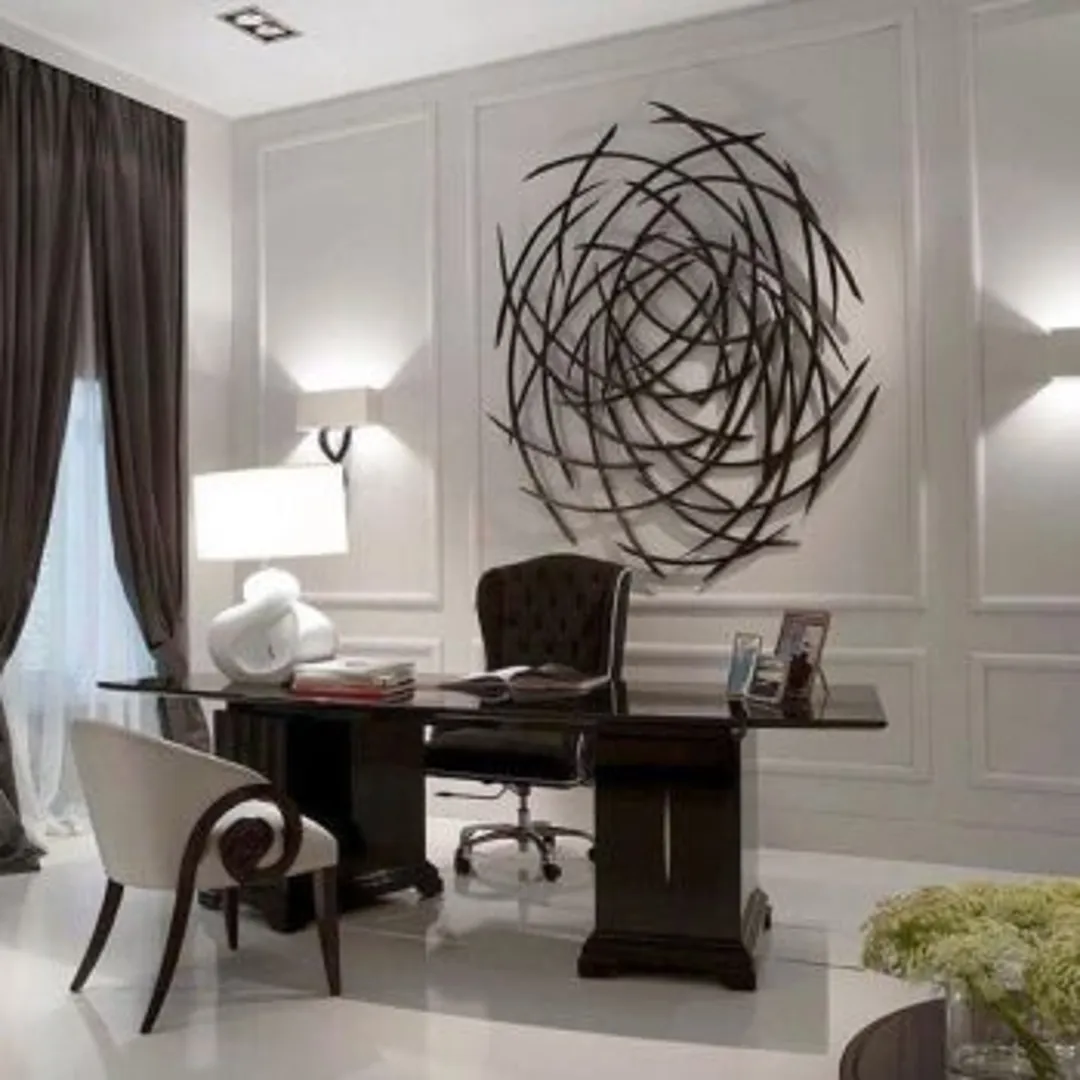 Используйте стену за рабочим столом, украсив большим произведением искусства или зеркалом. Установите скрытые светодиодные полосы под столом или офисными полками для интересного акцентирующего освещения.