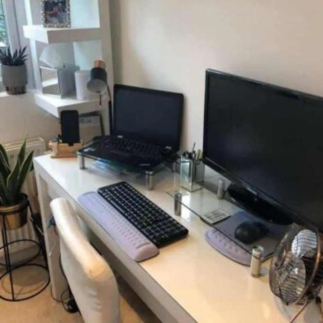 Уместить несколько устройств на одном столе может быть непросто. Инвестируйте средства в дизайн стола с многослойным верхом и встроенной полкой для клавиатуры и других периферийных устройств. Вы также можете добавить к существующему столу высокую подставку для компьютера.
