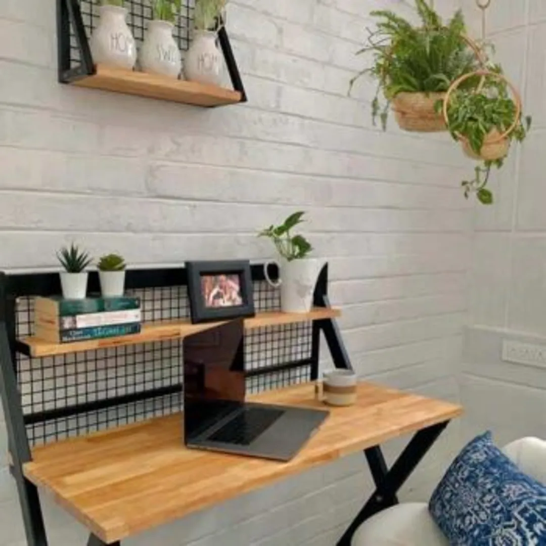 Выбирайте стол и стеллажи из массива дерева. Если текстура натурального дерева не соответствует вашему существующему интерьеру, слой краски легко все исправит.