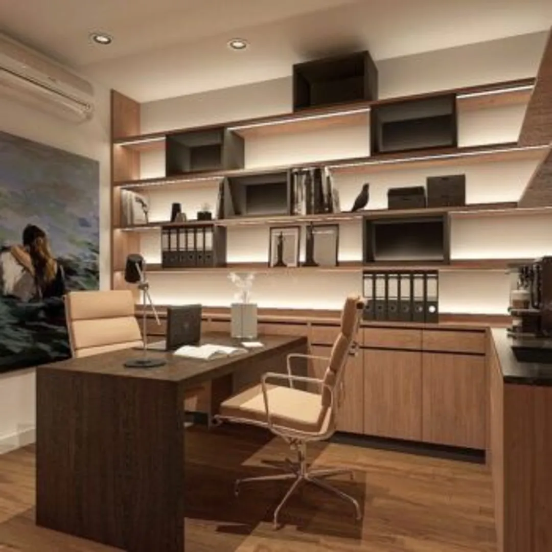 Меньше всего вам захочется прикрыть стильную встроенную офисную мебель безделушками. Сохраняйте простой интерьер рабочего стола и используйте элементы освещения для визуального увеличения размера своего рабочего пространства.