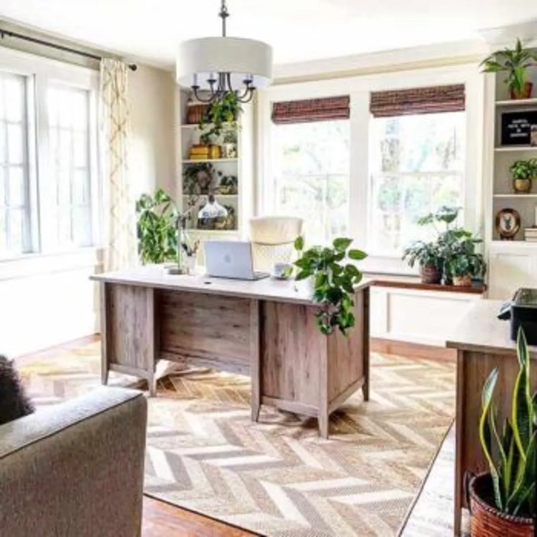 Деревянная офисная мебель отлично сочетается с другим естественным текстилем и интерьером. Древесина и листва идут рука об руку, поэтому зеленые комнатные растения станут отличным декоративным дополнением. Вы также можете приобрести настенные панно из макраме или мебель с плетеным акцентом.