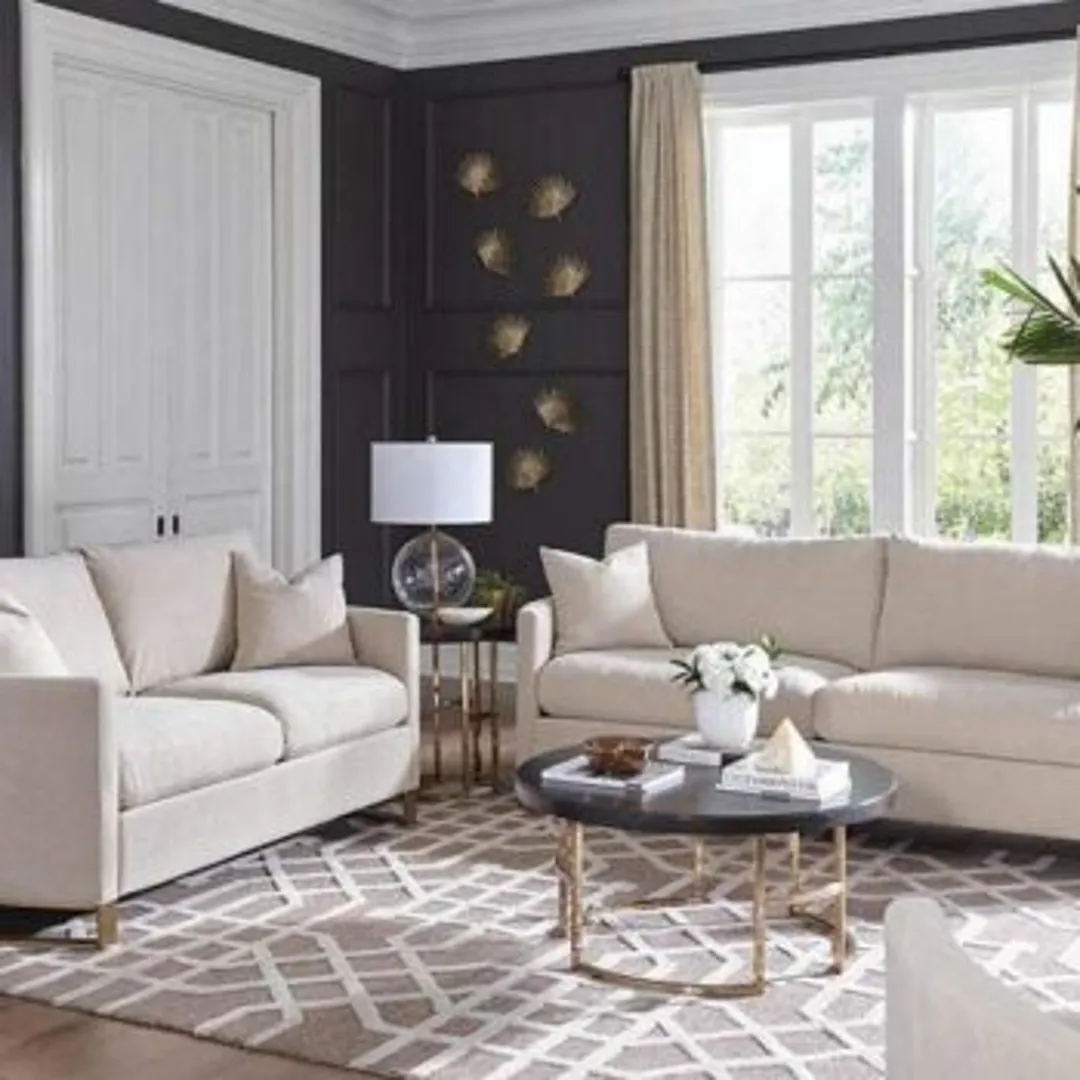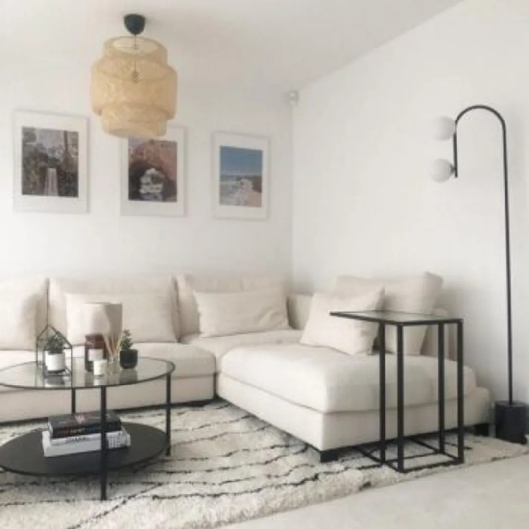 Если вам нравятся гостиные в стиле минимализма, тогда отлично подойдет белая цветовая палитра. Она прекрасно собирает все вместе, для оформления простого и чистого стиля помещения. Такой подход также хорошо работает в маленькой гостиной, где вы планируете расширить ее визуально и сделать светлой. Придерживайтесь белой мебели и украсьте пространство металлическим журнальным столиком. Он поможет сохранить ощущение открытости в середине гостиной.