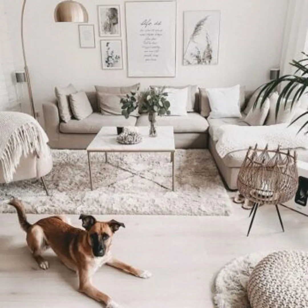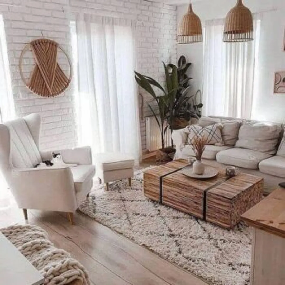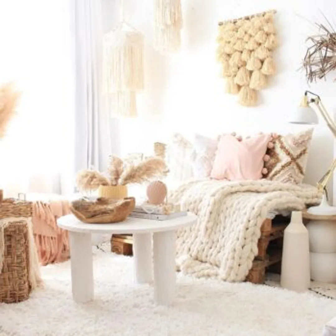 Для удачного образа, выберите коврик ручной работы с акцентом на натуральные материалы и цвета. Он означает, что белый цвет сочетается с нейтральными оттенками, такими как коричневый и хаки. Декоративные подушки могут быть сделаны вручную из макраме. Рассматривая другие идеи украшения, старайтесь придерживаться деревянных тонов; они добавят тепла в вашу белую богемную гостиную.