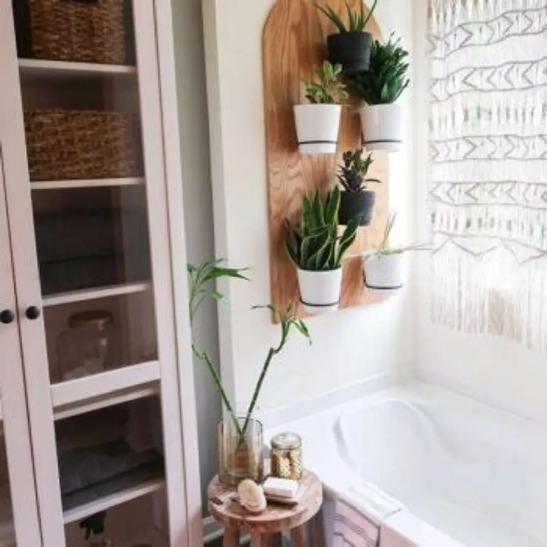 Свободные плоские поверхности могут быть редкостью в ванной комнате, поэтому купите компактный стеллаж для небольших растений. Используйте растения с крупной драпирующейся листвой (например, монстера и пальмовые листья) в качестве обрамления ванны или душа. Повесьте виноградные растения над головой и дайте им спускаться вниз для максимального использования доступного пространства.