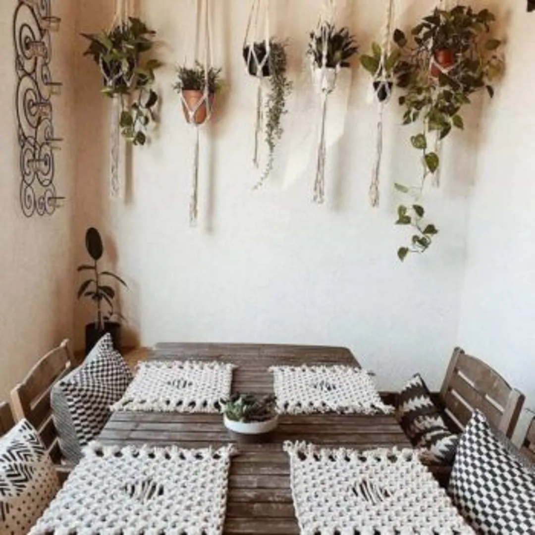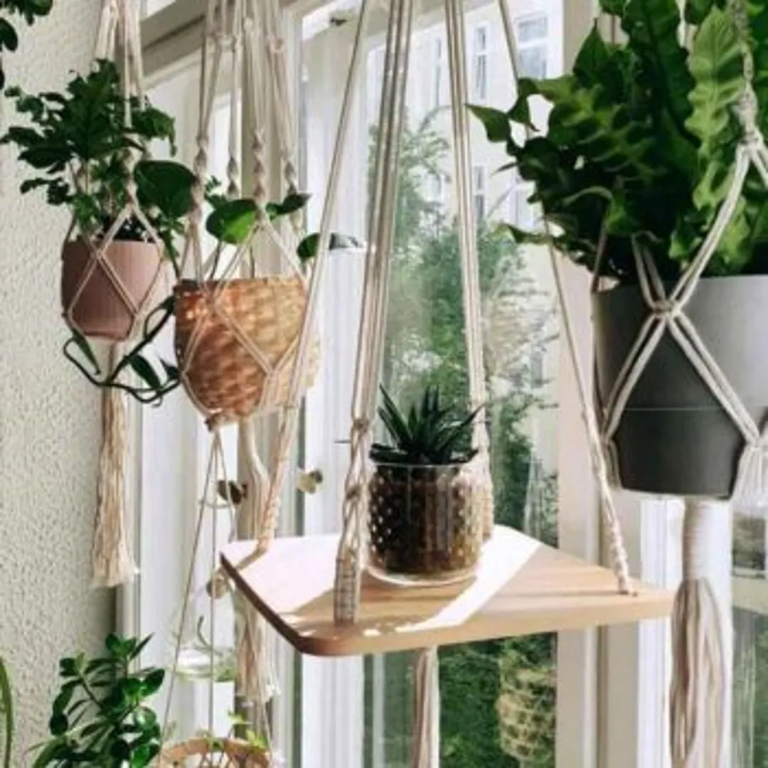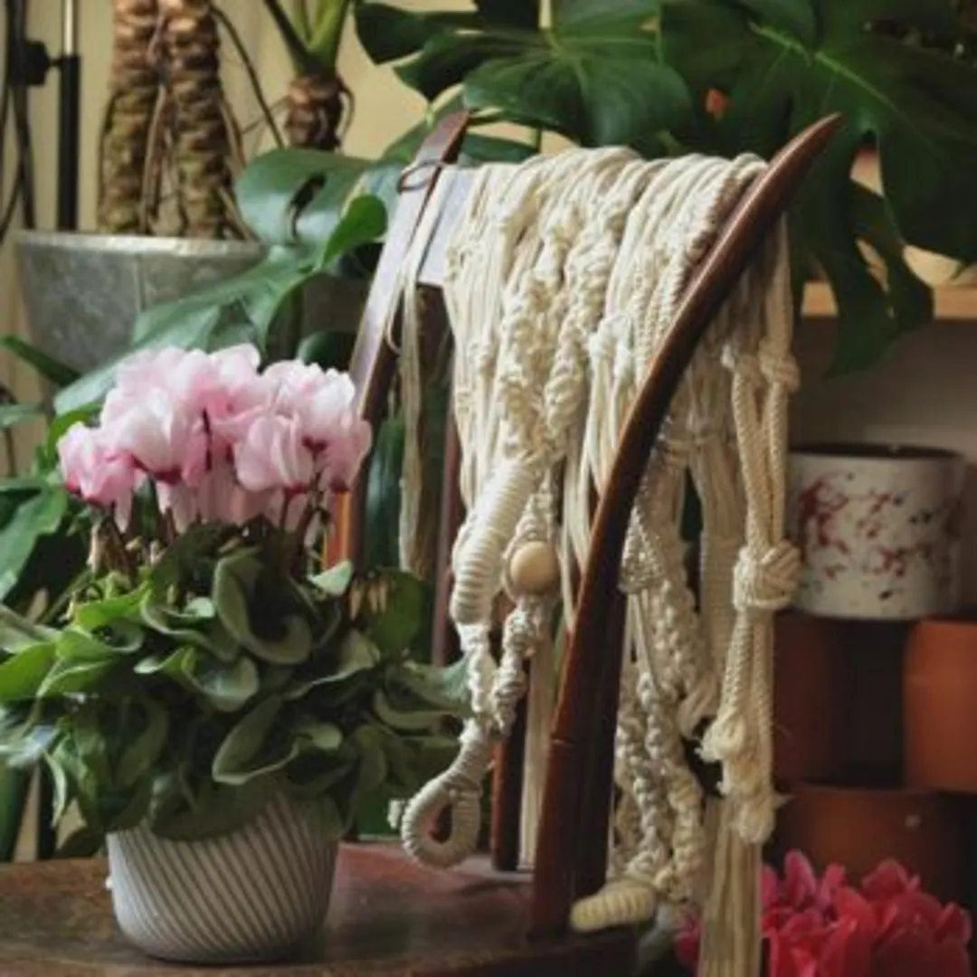 Замаскируйте холодные терракотовые горшки для цветов плетеными чехлами, смягчая общий вид сада в вашей спальне. Вешалки из веревки макраме отлично подходят для спальни, оформленной в современном, богемном или деревенском стиле.
