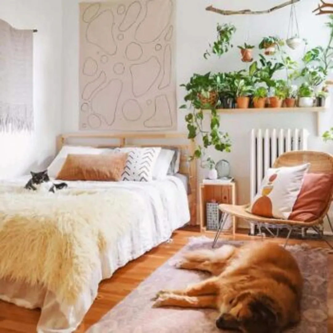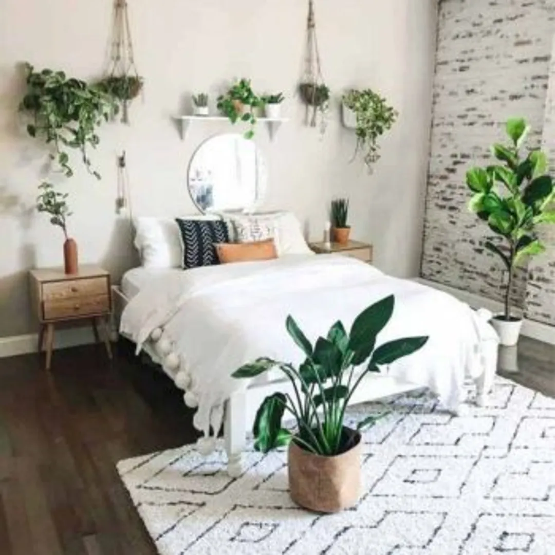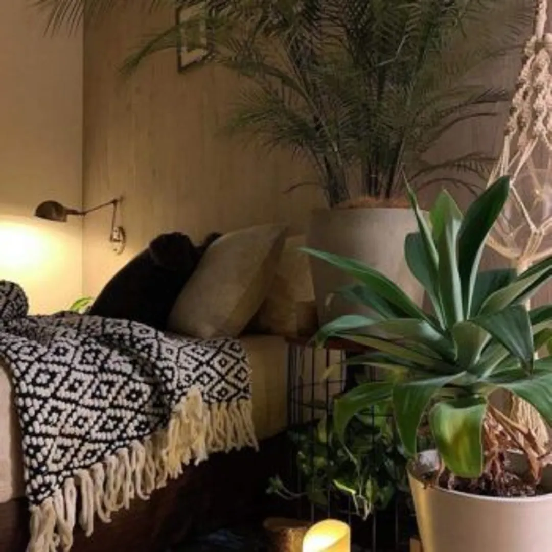 Замаскируйте холодные терракотовые горшки для цветов плетеными чехлами, смягчая общий вид сада в вашей спальне. Вешалки из веревки макраме отлично подходят для спальни, оформленной в современном, богемном или деревенском стиле.