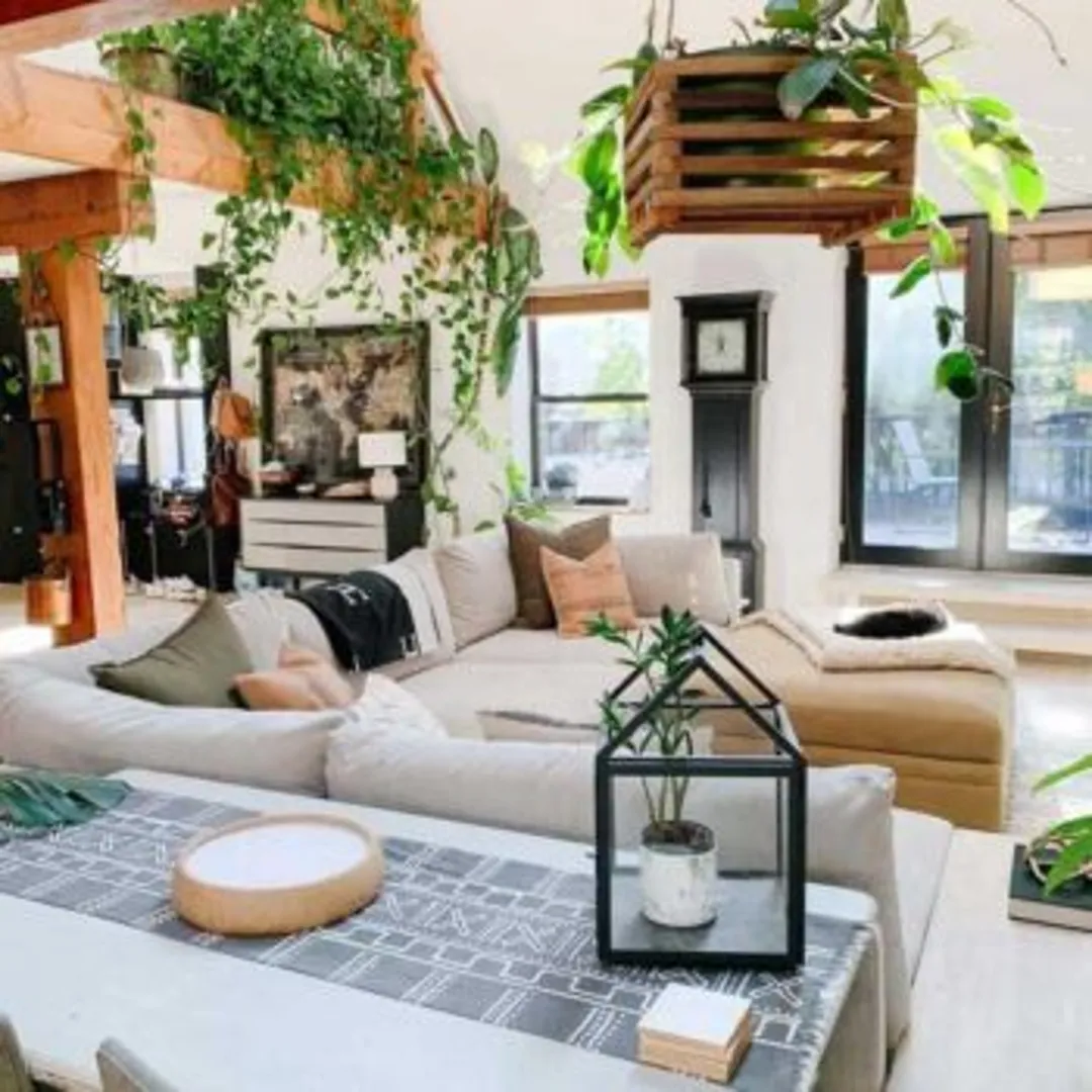 Одна из суперпопулярных тенденций – использовать коряги в качестве опоры для подвесных корзин. Вы можете выбрать традиционный глиняный горшок или использовать каменную емкость с соответствующим природным естественным видом. Для оригинального и современного стиля развесьте растения на металлическом карнизе или переделанной вешалке для одежды.
