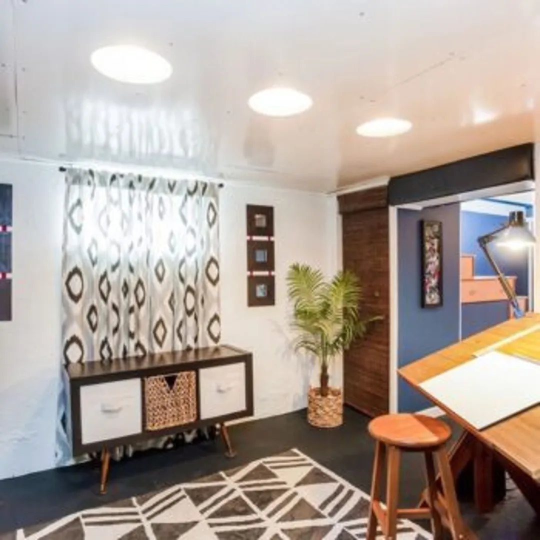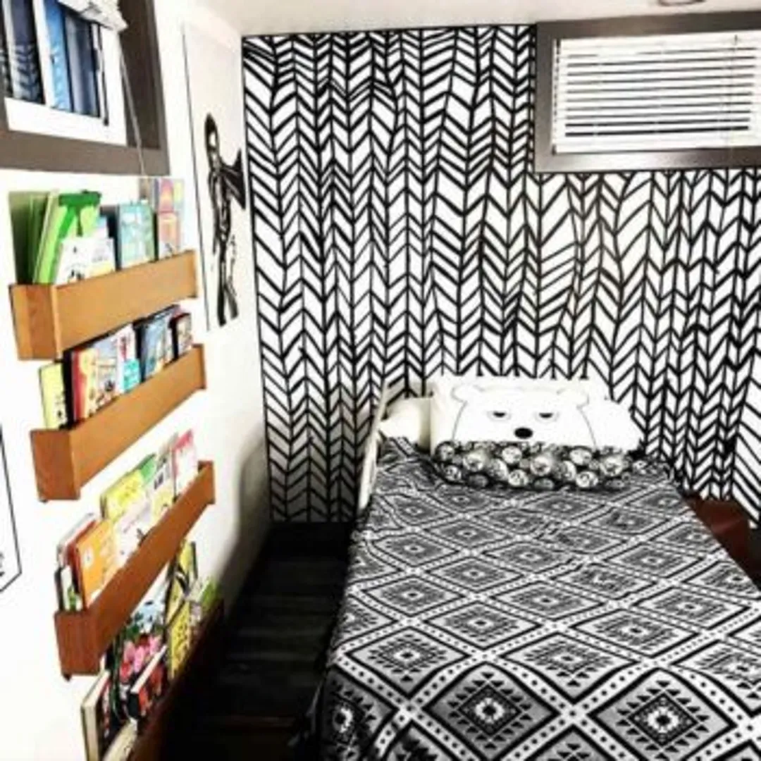 Наклейте обои на гипсокартон или другую поверхность. В каждой зоне можно использовать отдельный дизайн для разграничения различных пространств. В основной жилой зоне используйте простой рисунок. Затем что-то с более смелым рисунком на стене мини-кухни.