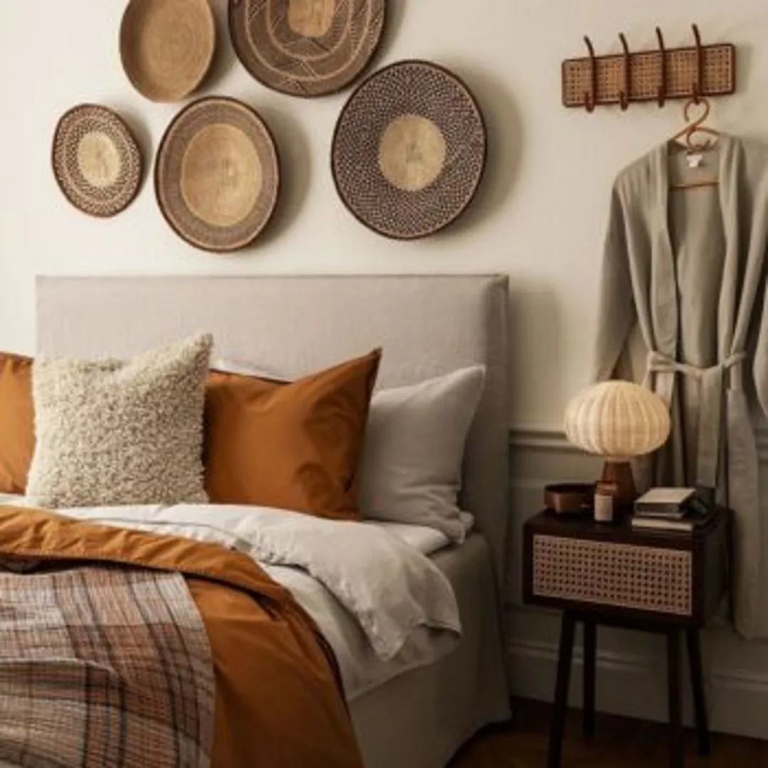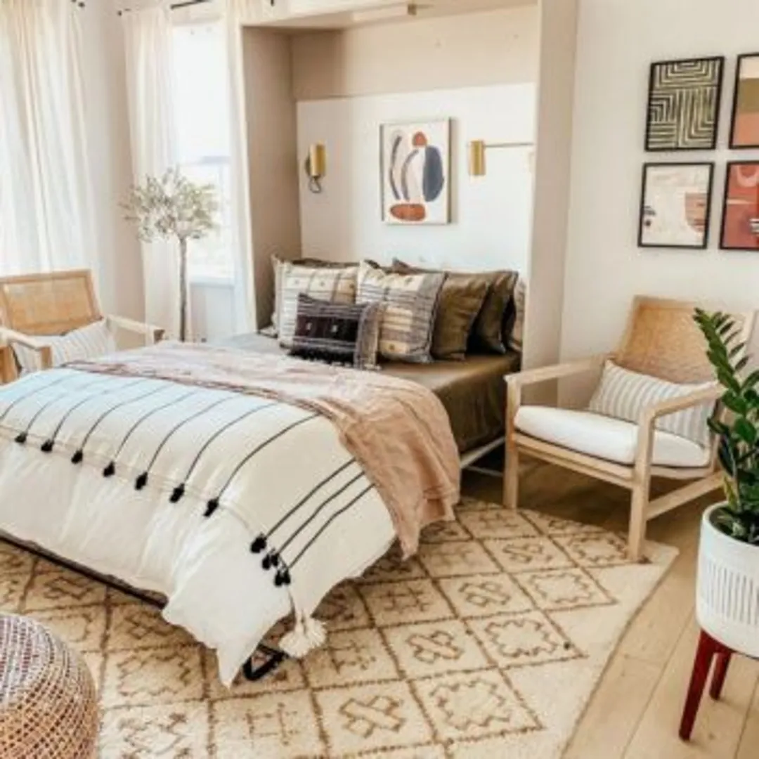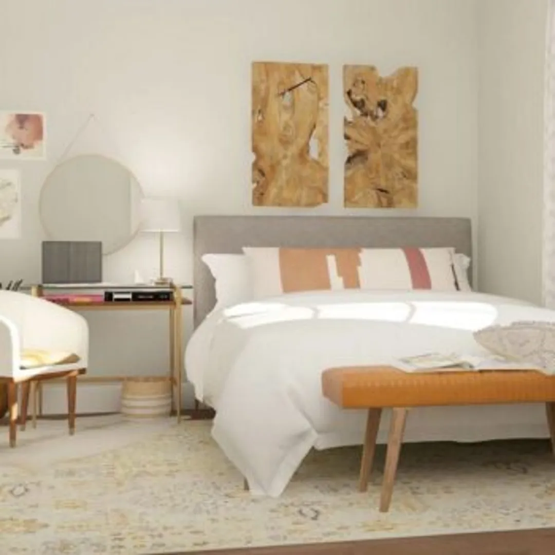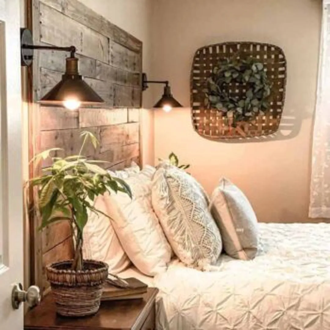 В идеале кровать должна стоять у самой длинной стены спальни, что делает ее главной фокусной точкой комнаты. Идеи оформления включают в себя добавление обшивки, бисера или панелей только на эту стену, покрасив ее в цвет, контрастирующий с краской на остальных трех стенах. Повесьте над панелями венок или выстройте ряд сочетающихся между собой рисунков или фотографий.
