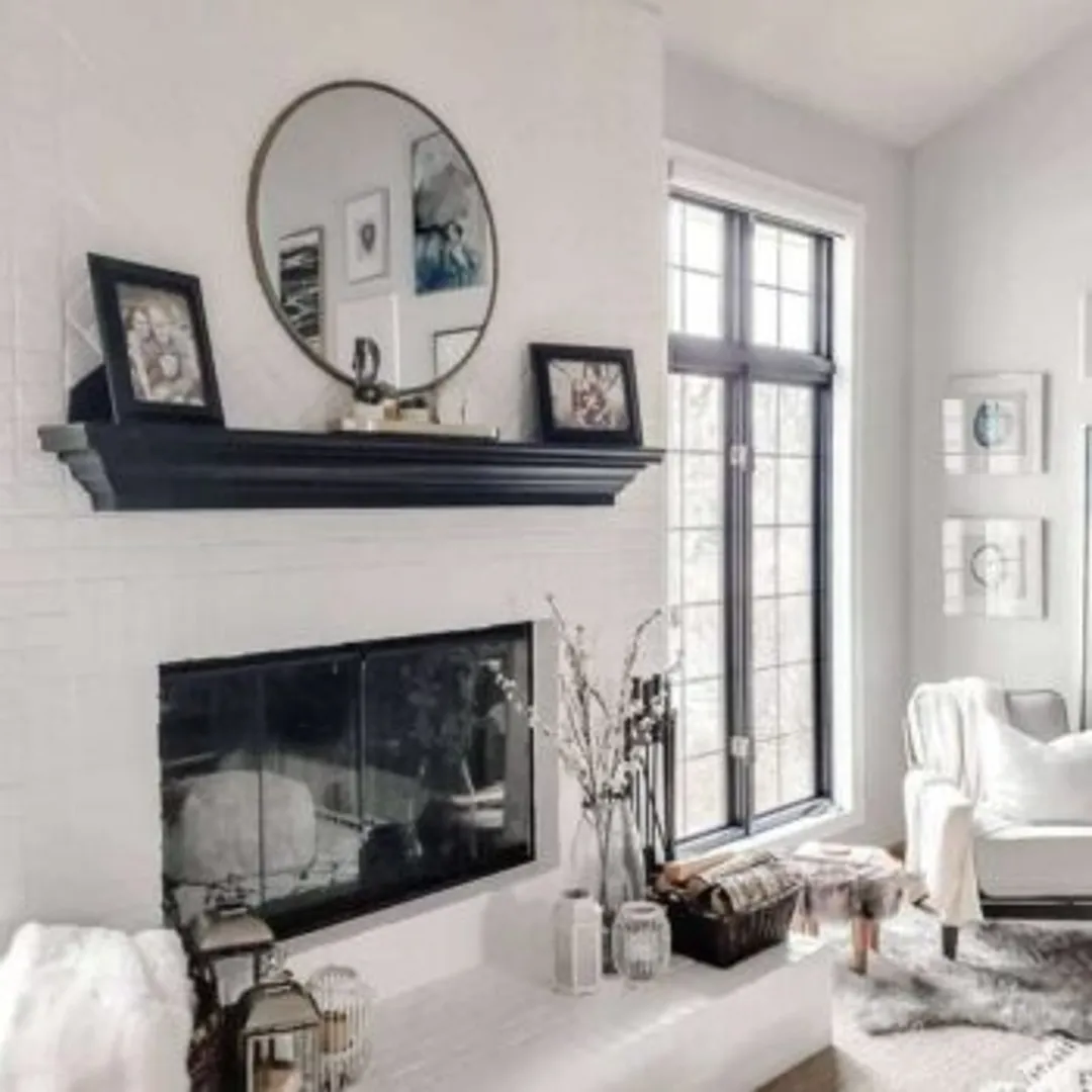 Поместите большое зеркало в рамке над камином или над кроватью. Вокруг него можно разместить небольшие предметы искусства, венки, вдохновляющие цитаты или наклейки. Зеркала любого размера помогают расширить небольшое пространство. Даже коллекция крошечных зеркал в рамочках добавит сверкающий акцент пустой стене.