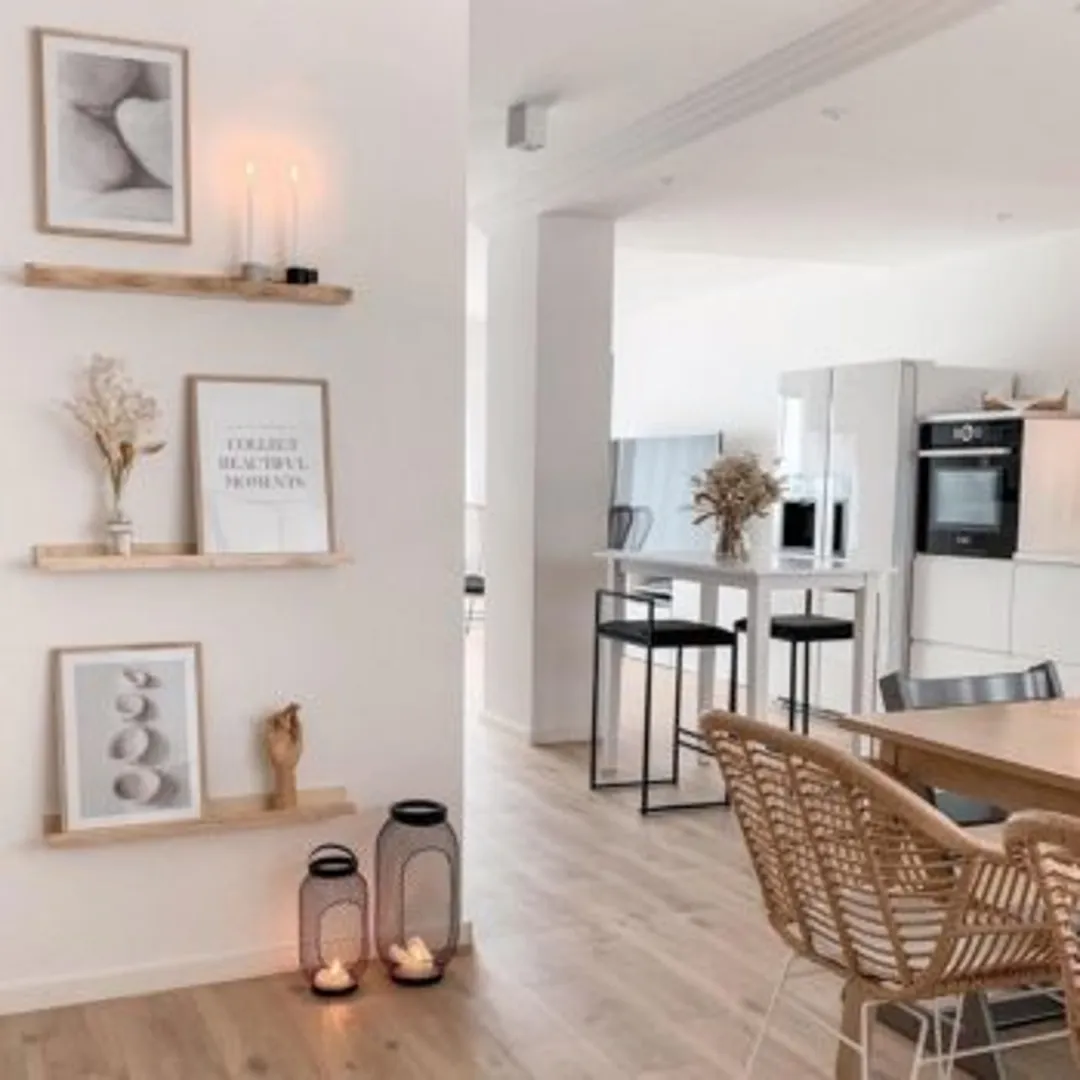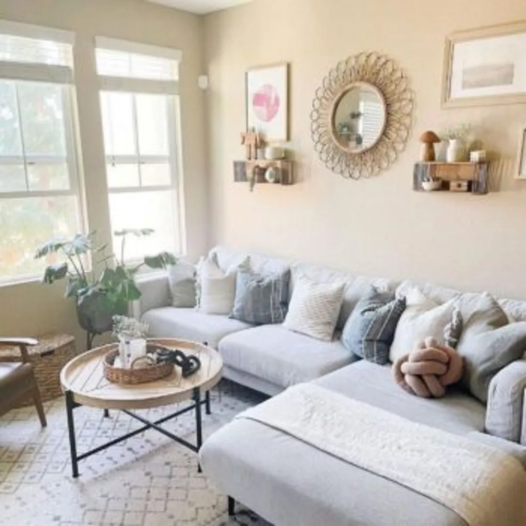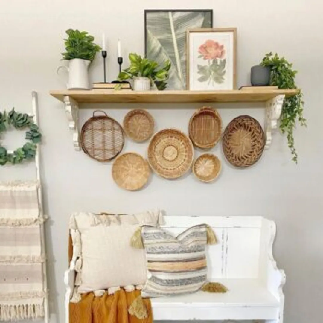 При хранении предметов на настенной полке позаботьтесь об эстетичном расположении вещей. Варьируйте высоту рамок для фотографий, ваз, свечей, растений и других предметов интерьера на полке. Повесьте над полкой металлическую монограмму или мандалу, чтобы придать ей креативности, или поместите в это пространство зеркало для расширения пространства небольшой комнаты.