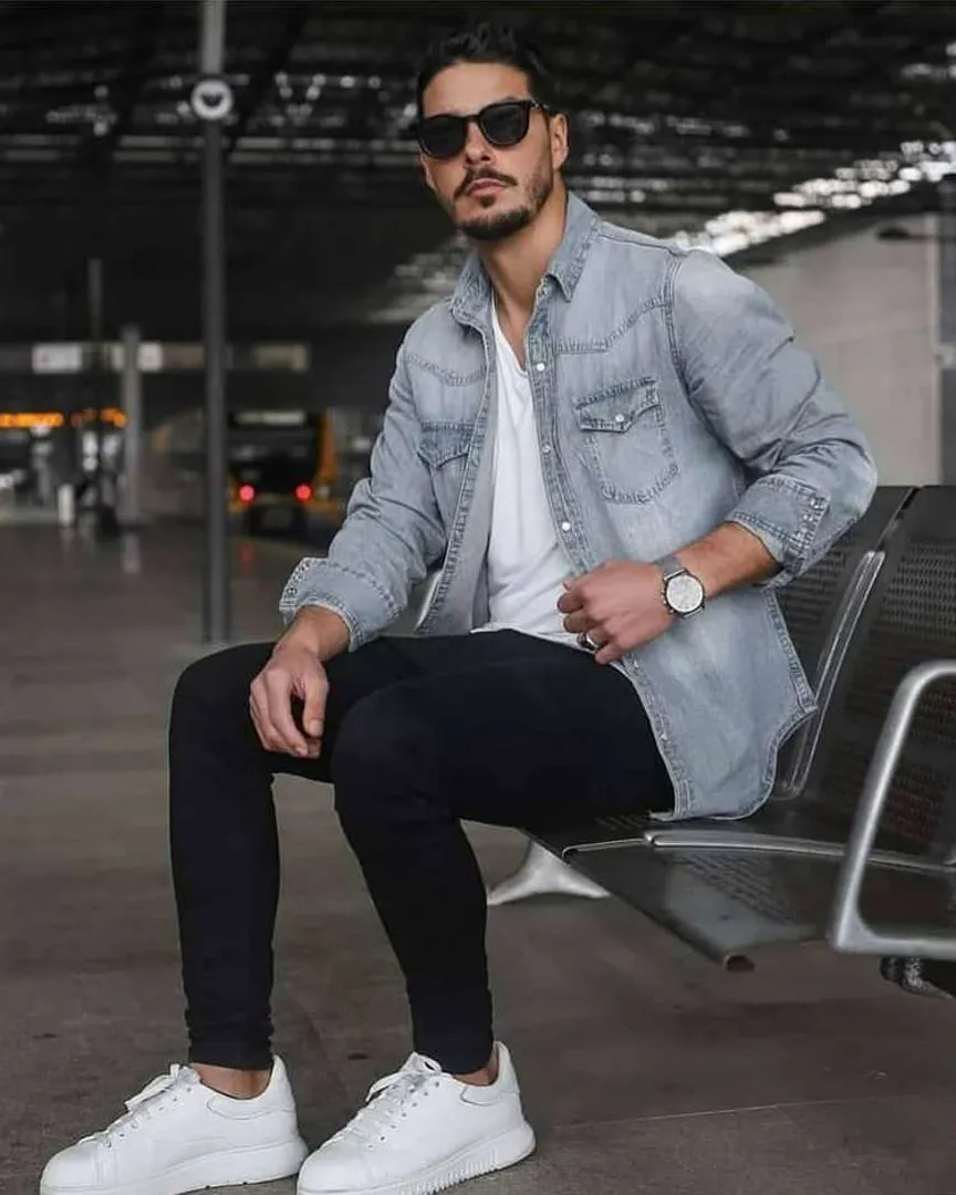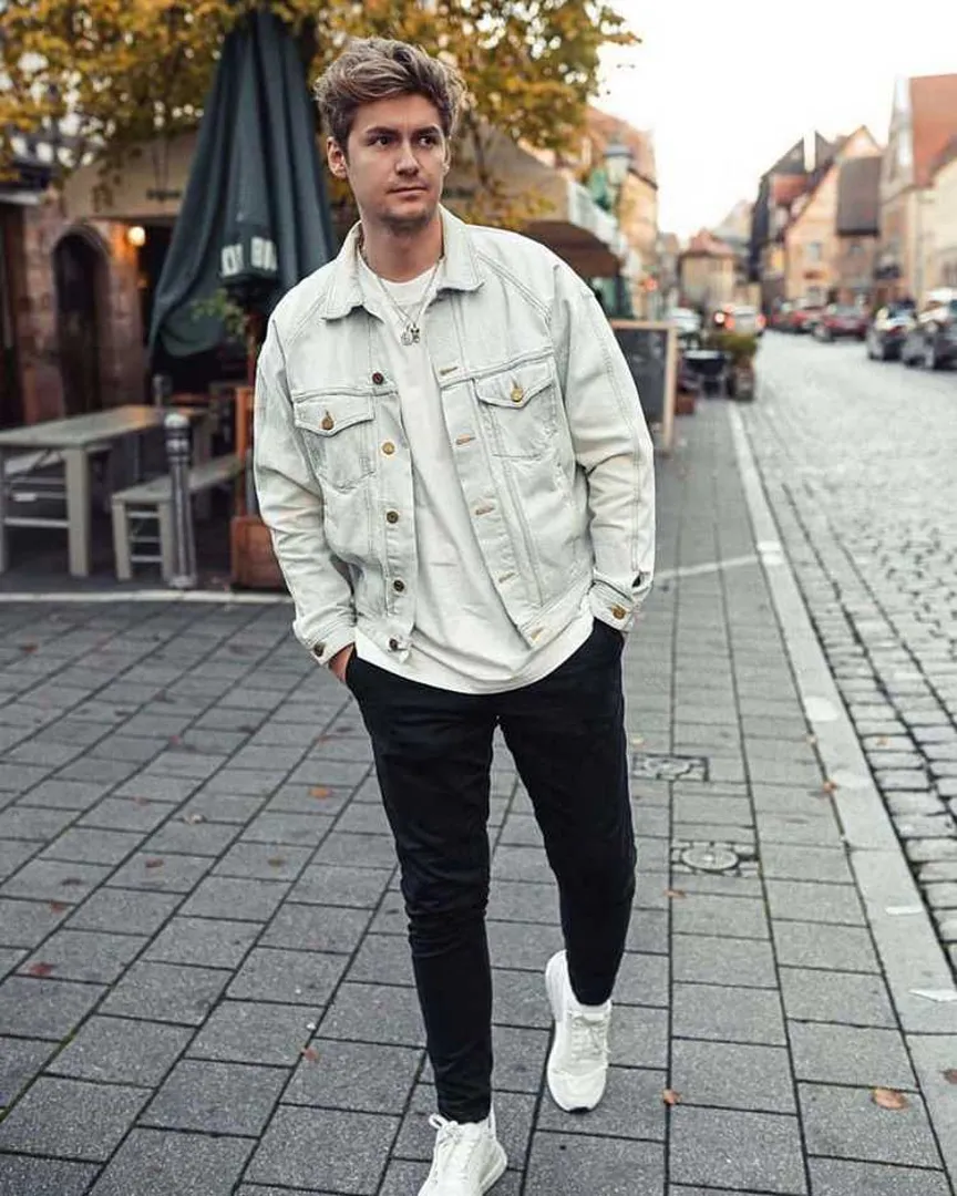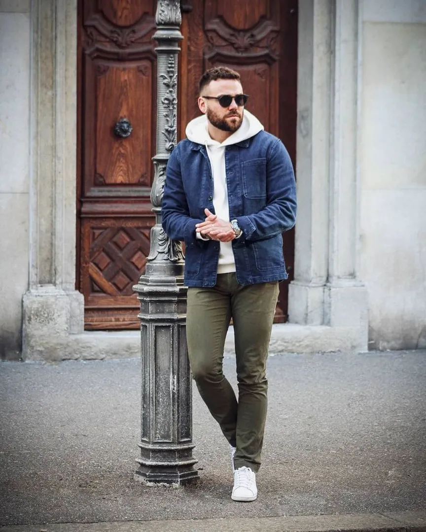 Если вы собираетесь надеть джинсовую куртку с джоггерами, это не обязательно должно выглядеть так, как будто вы только что встали с постели. Экспериментируйте с хлопковыми рубашками и классными кроссовками. Можете еще добавить сюда толстовку с капюшоном.