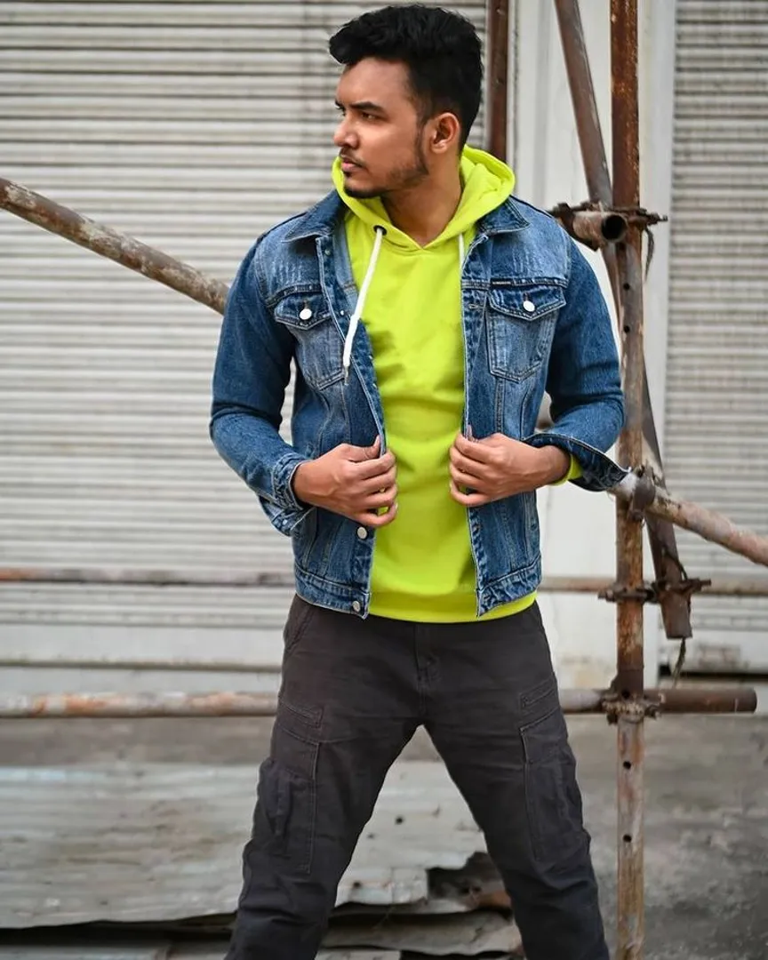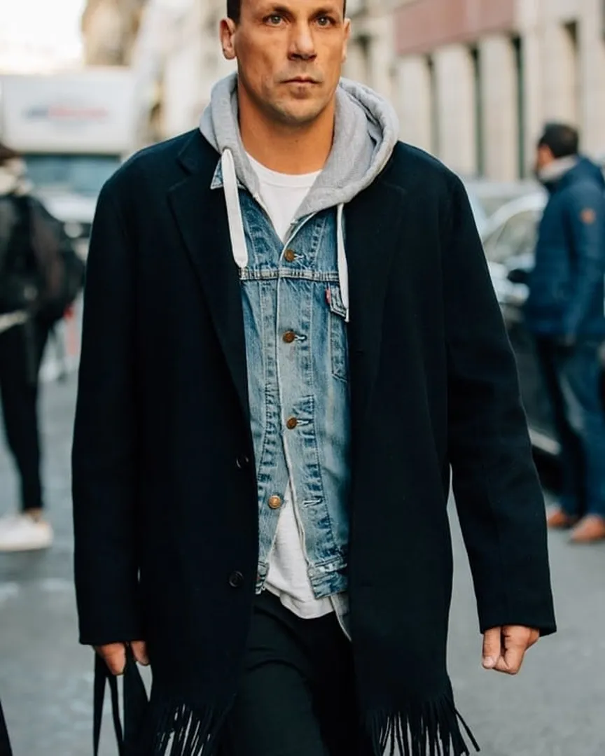 Подбирая худи к джинсовой куртке, в ваше распоряжение открывается вся палитра цветов. Чтобы создать простой однотонный образ, наденьте полностью черный наряд, в том числе черный худи, с более светлым оттенком или бежевой джинсовой курткой. В этом случае куртка станет самым заметным элементом.