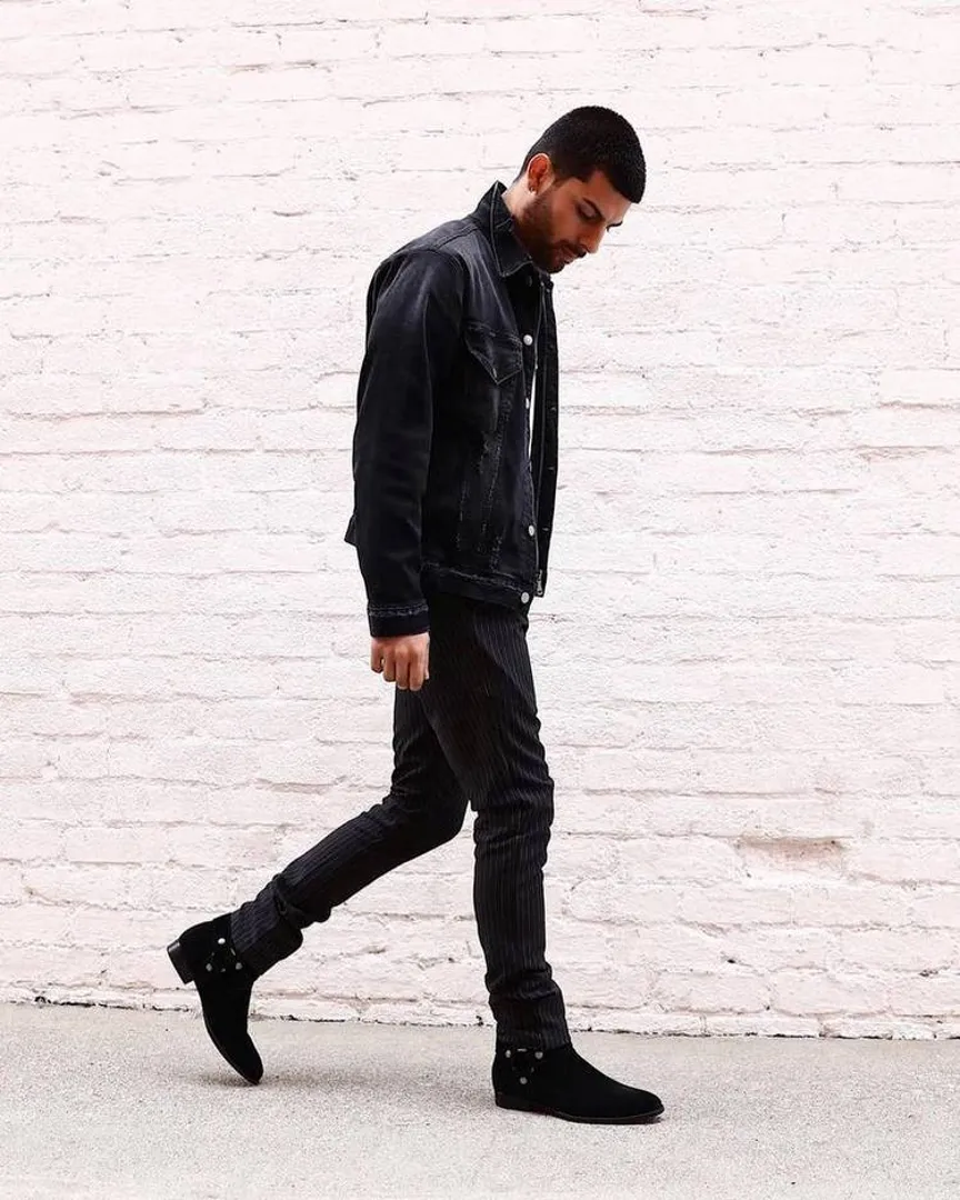 Создайте загадочный образ тотал блэк но с джинсами с рисунком или рванками. Обратите внимание на такие аксессуары, как винтажный жилет или шляпа-федора.