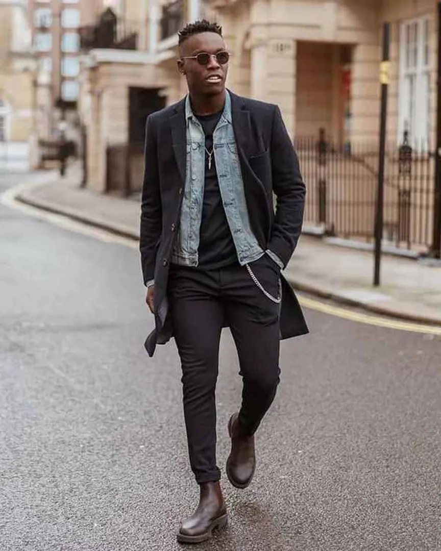 Более темный наряд, состоящий из черного пальто, рубашки и джинсов, можно запросто дополнить светлой джинсовой курткой. В сочетании с верхней одеждой вы сможете согреться в прохладные месяцы, не выглядя громоздко и не надевая всевозможные зимние аксессуары, шарфы и шляпы.