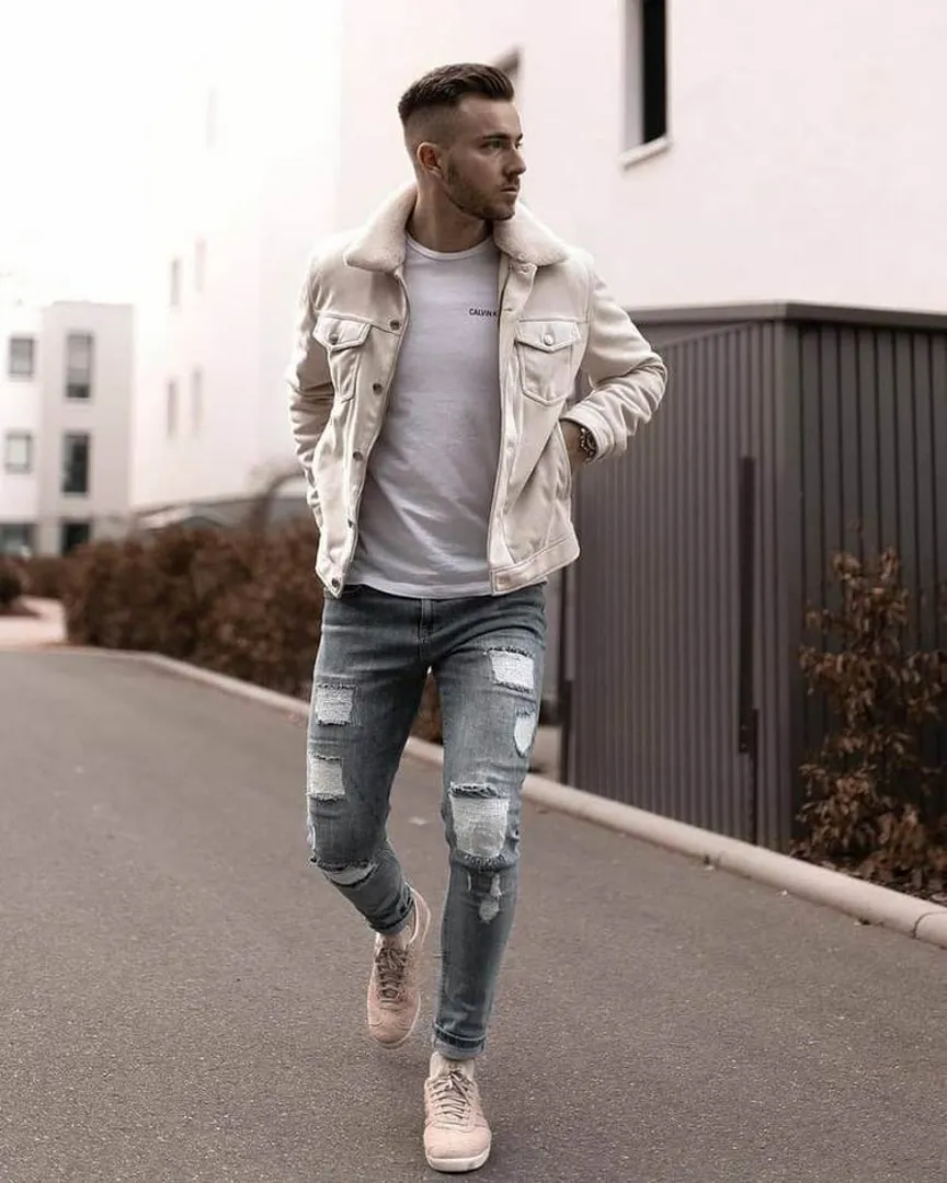 Контаминация джинсов с джинсовой курткой может быть опасной, когда дело доходит до правильного сочетания. Играйте на контрастах. Белую джинсовую куртку надевайте под черные джинсы или под светлый верх подбирайте темный низ. Соединяя это с белой футболкой, вы создадите образ, который будет говорить за вас: «Я надел первую попавшуюся одежду, но выгляжу стильно».