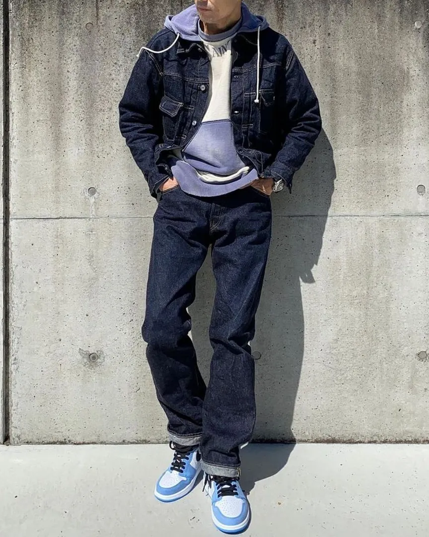 Если вы собираетесь щеголять в джинсовой куртке со штанами на заказ, вы рискуете смешать два стиля. Поэтому сохраняйте все в схожей цветовой гамме, предпочтительно более темной расцветки, такой как черный или синий.