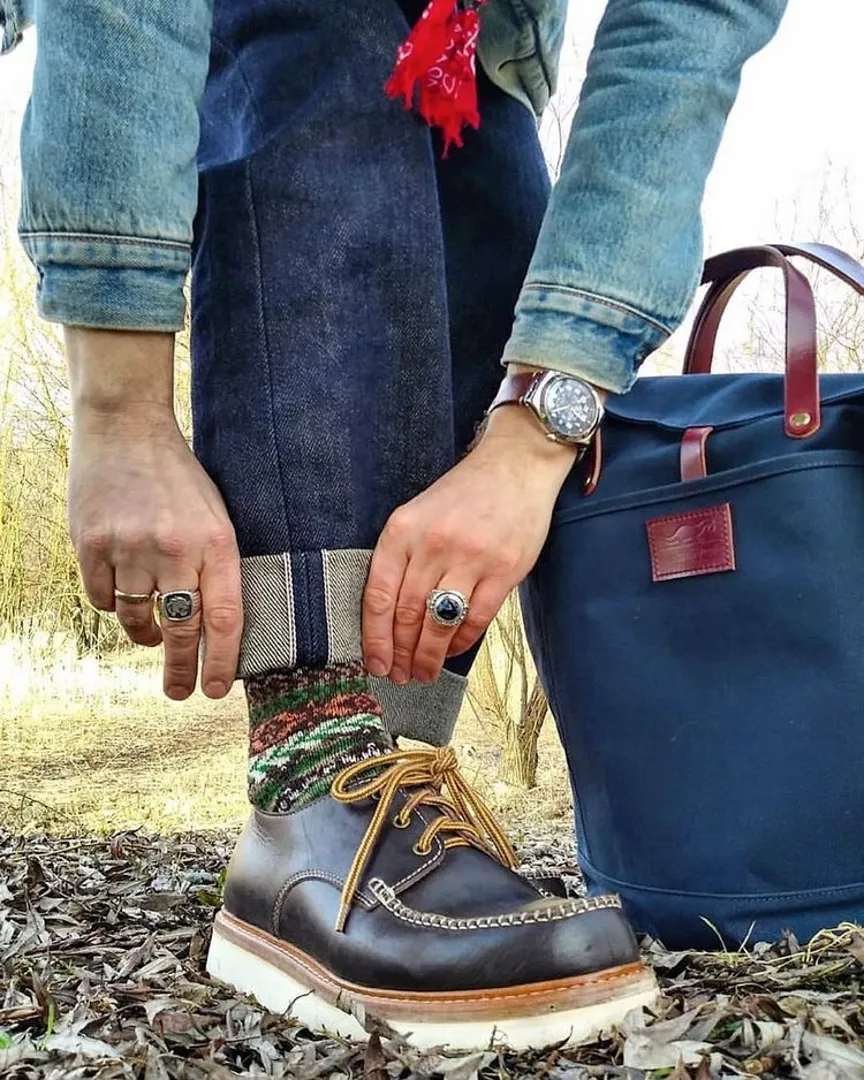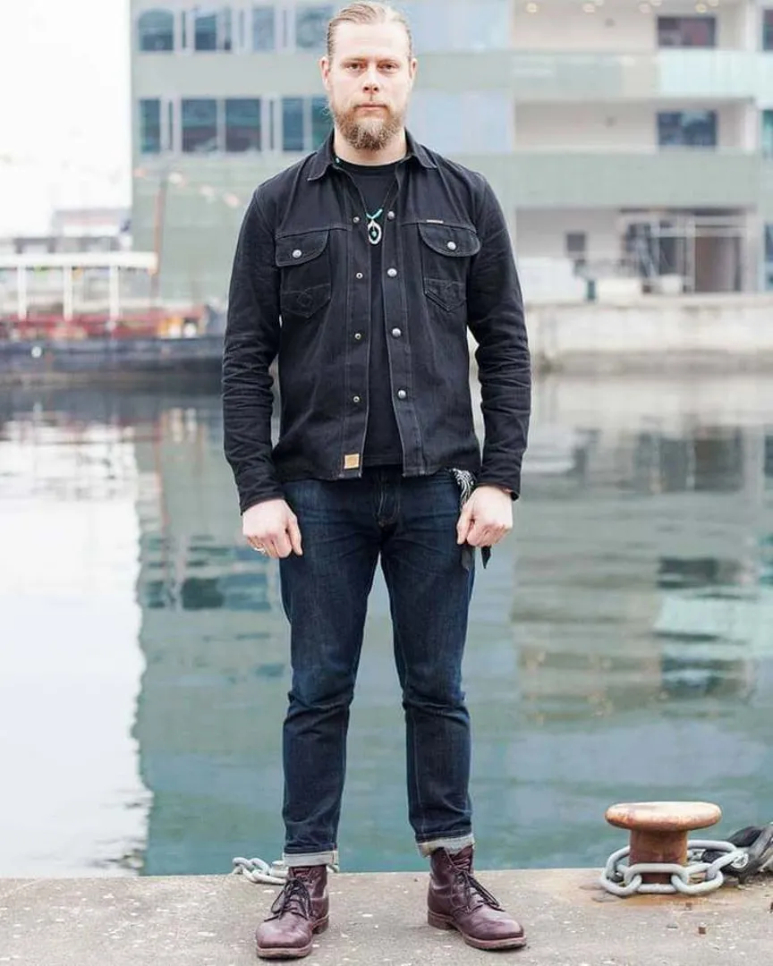 Наряд из темного денима выглядит особенно круто в сочетании с банданой или зачесанными назад волосами в стиле байкеров. Для завершения общей картины купите ботинки на шнуровке. Темная джинсовая куртка со штанами цвета индиго может показаться чересчур громоздкой, поэтому старайтесь подбирать верхнюю одежду не слишком из плотного материала.
