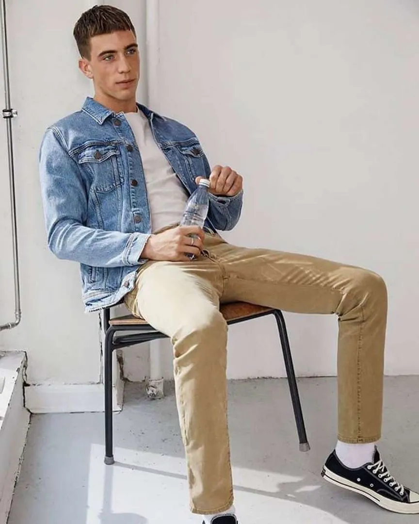 Джинсовая куртка с брюками чинос – идеальное сочетание двух универсальных предметов одежды. Чинос можно легко носить с изысканным, элегантным вечерним или повседневным луком. Собственно, как и джинсовую куртку. Дополнив эти две детали правильными аксессуарами, ваш образ заиграет новыми красками.