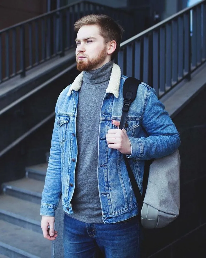 Водолазка и джинсовая куртка лучше всего сочетается с темным денимом и таким же верхом. Хотя, если вы предпочитаете более светлые цвета, придерживайтесь одинаковых оттенков.