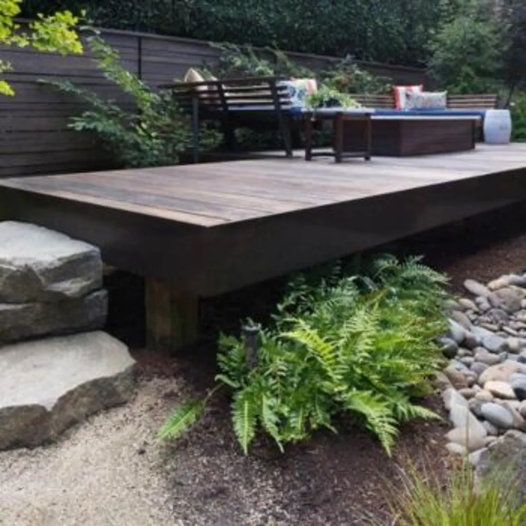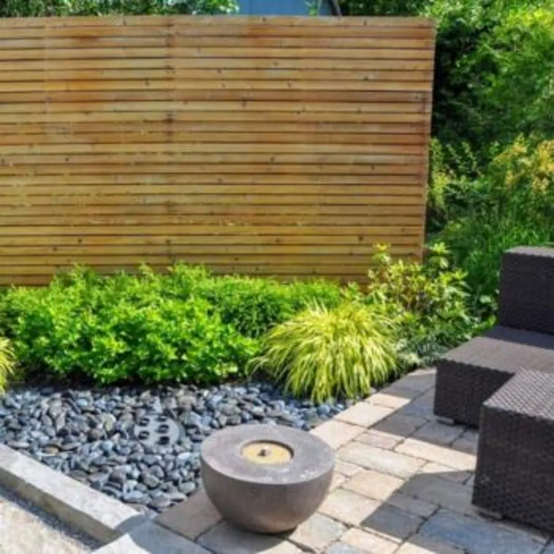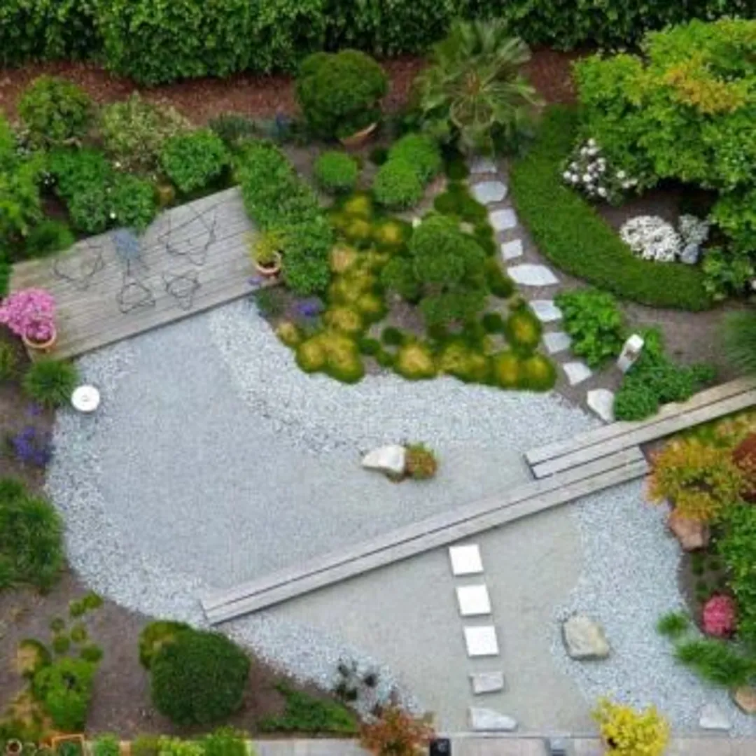 Поскольку обе эстетики уделяют внимание четким линиям, начните с разделения пространства на определенные секции. Для этого можно выделить участки травы, создать патио или дорожку, идущую от навесного сада. Можно использовать разноцветный гравий для выкладывания геометрических узоров.