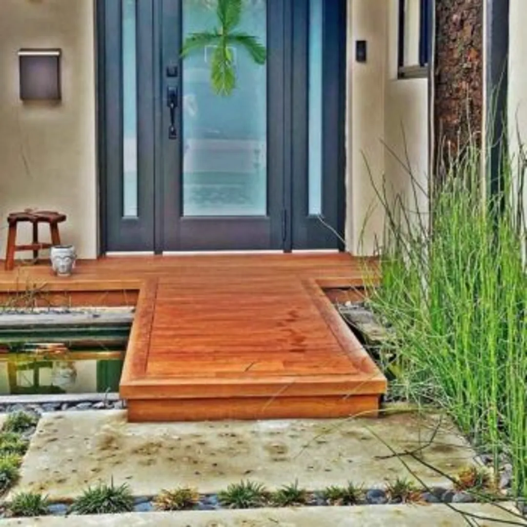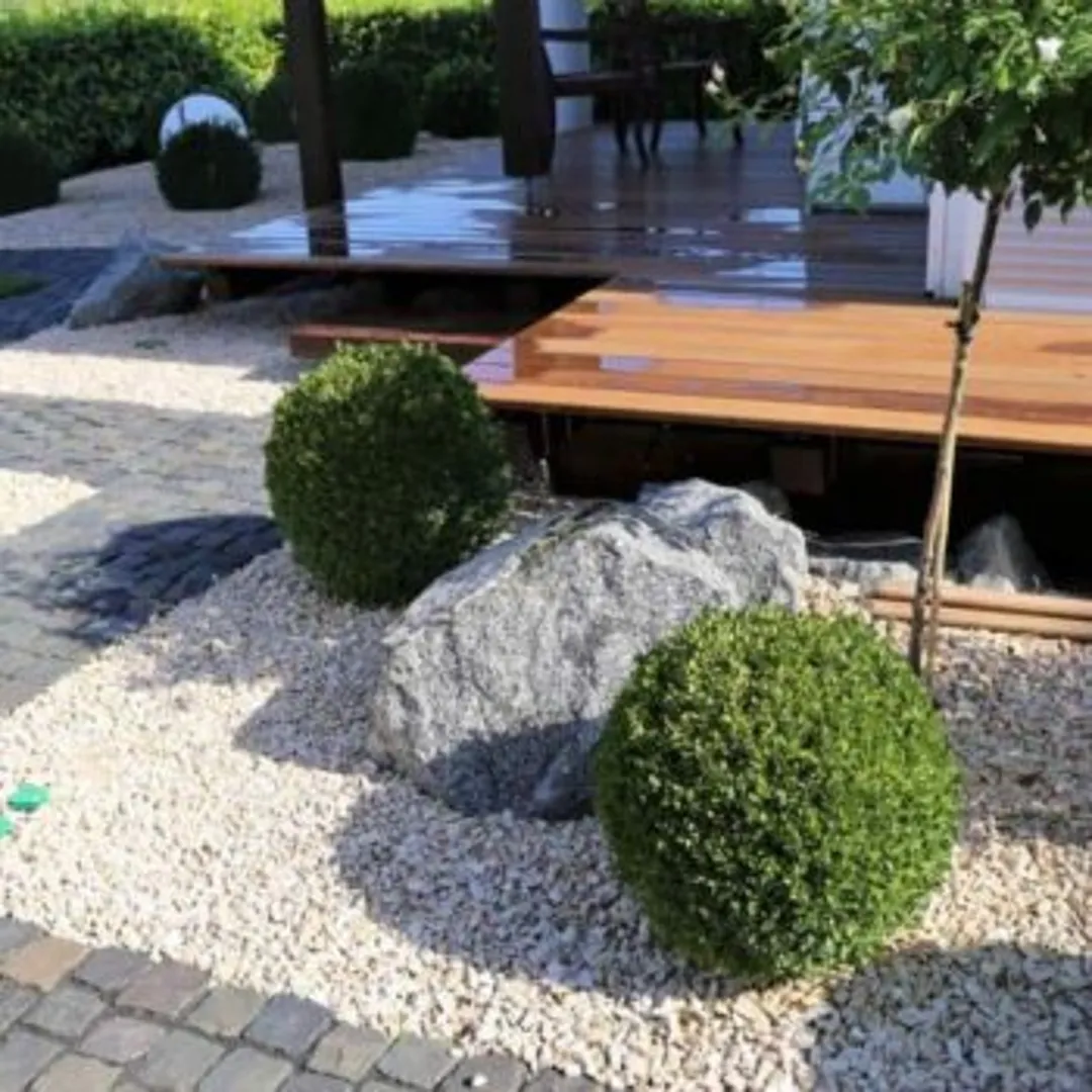 Что касается деревьев, вечнозеленые породы и японский клен представят идеальную смесь дзена с современностью. Вместо цветов выбирайте кустарники и декоративные травы с уникальной окраской листьев. Тщательно подрезайте изгородь и многолетники, чтобы достичь аккуратного вида, который ассоциируется с дзен-садоводством.