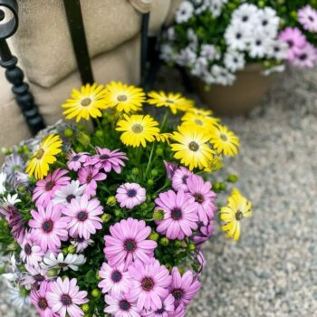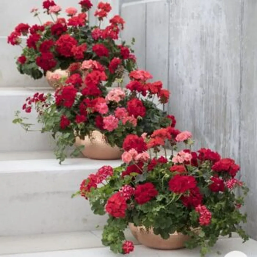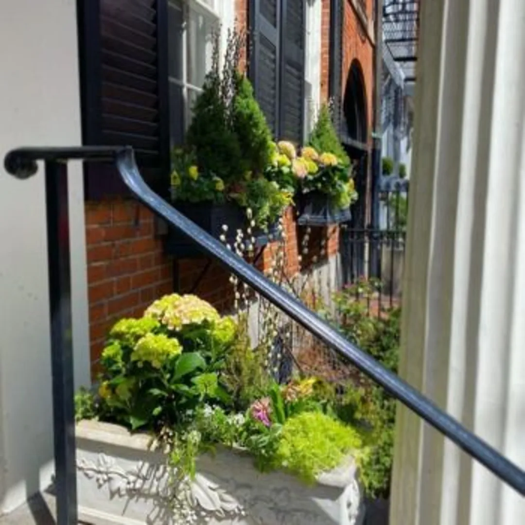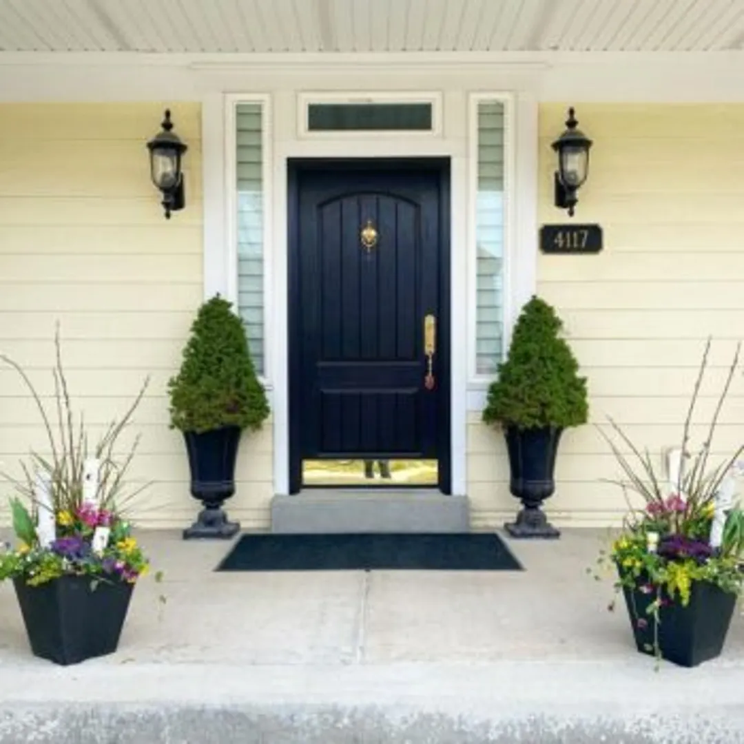 Расположите емкости с цветами в несколько ярусов возле лестницы вашего крыльца или в виде группы, обрамляющей входную дверь. Хотя растения следует выдерживать в одной цветовой гамме, набор емкостей слегка разнообразьте.