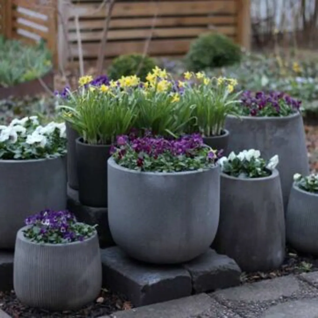 Если вы хотите, чтобы ваш контейнерный сад выглядел как произведение искусства, хорошая база обязательна. Приобретите набор совмещаемых, прочных емкостей, чтобы каждый год вновь заселять их любимыми однолетниками. В зимние месяцы вместо цветов ставьте в них сухие ветви, сажайте травы и вечнозеленые растения.