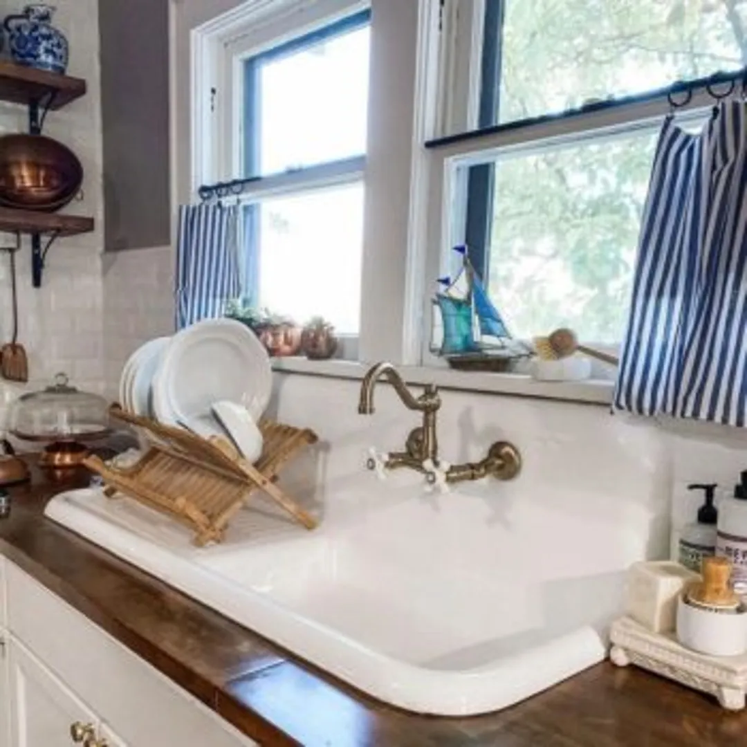 Для кухни в стиле кантри подойдут полосатые шторы из чайных полотенец. Вы можете использовать старую ткань от полотенец или купить готовые портьеры для использования их в качестве штор для кафе или короткого валанса.