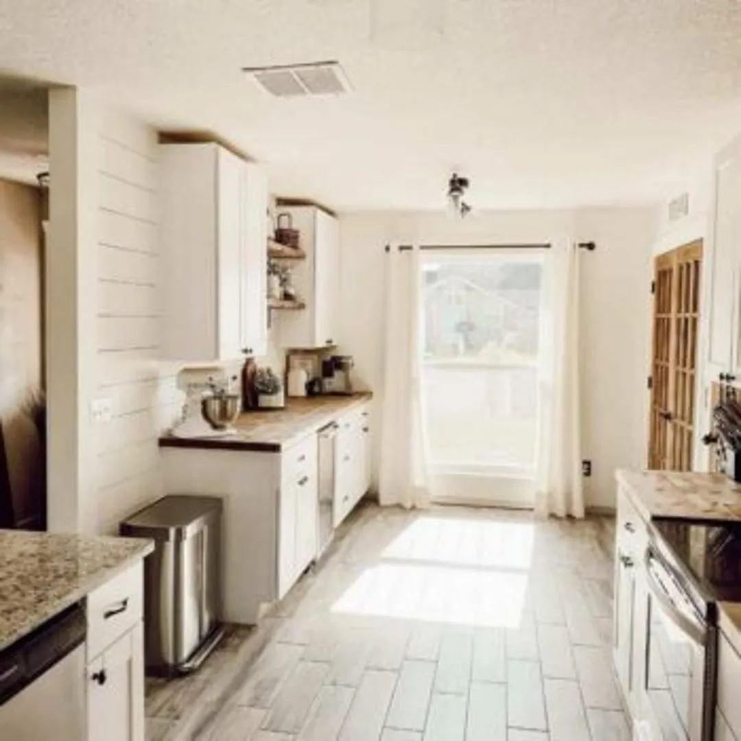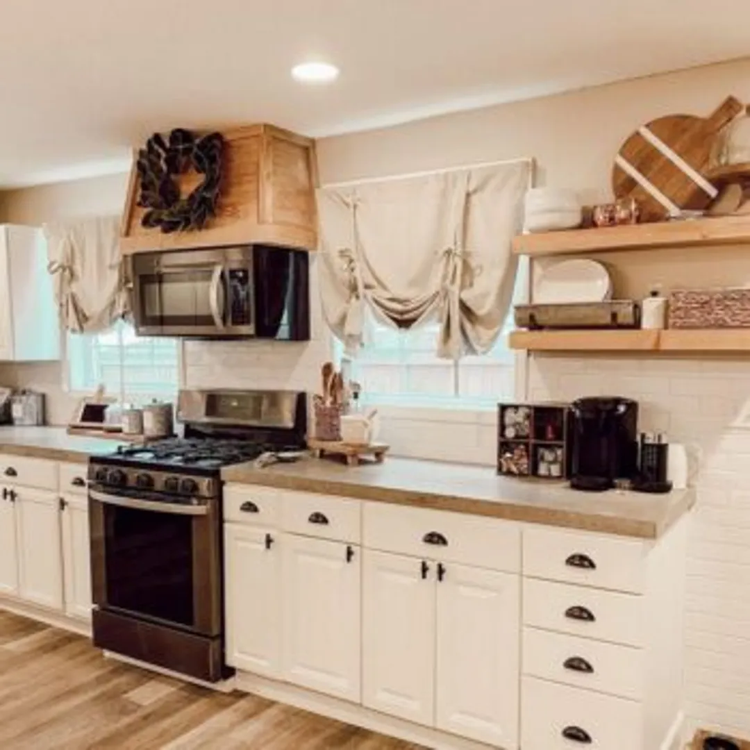 Несмотря на то, что большинство хозяев дома предпочитают современный кухонный интерьер, вы все равно можете использовать серые оконные занавески в помещении, вдохновленном фермерским стилем. Повесьте полупрозрачный комплект ярусных штор или рулонные для смягчения образа в целом.