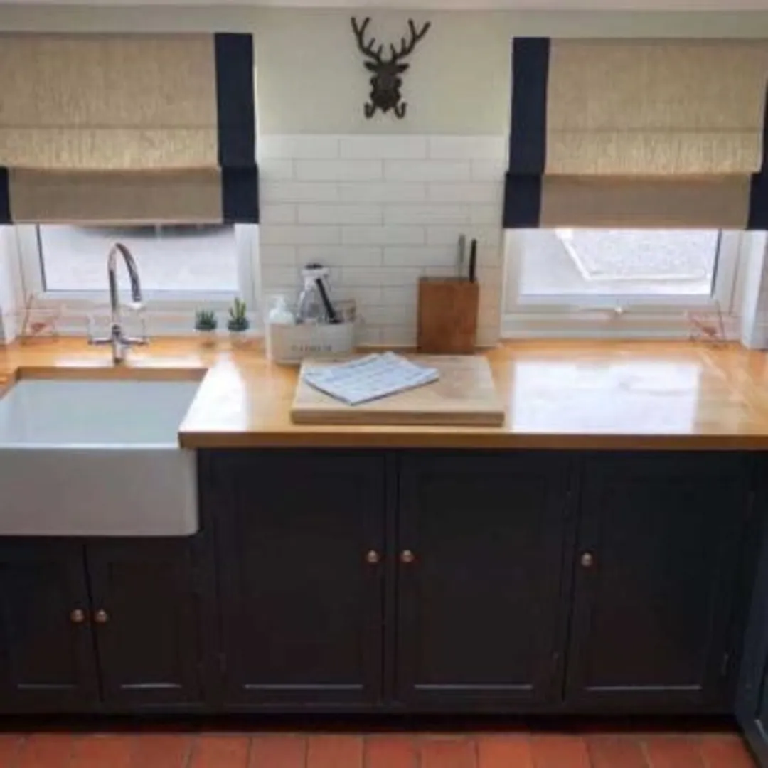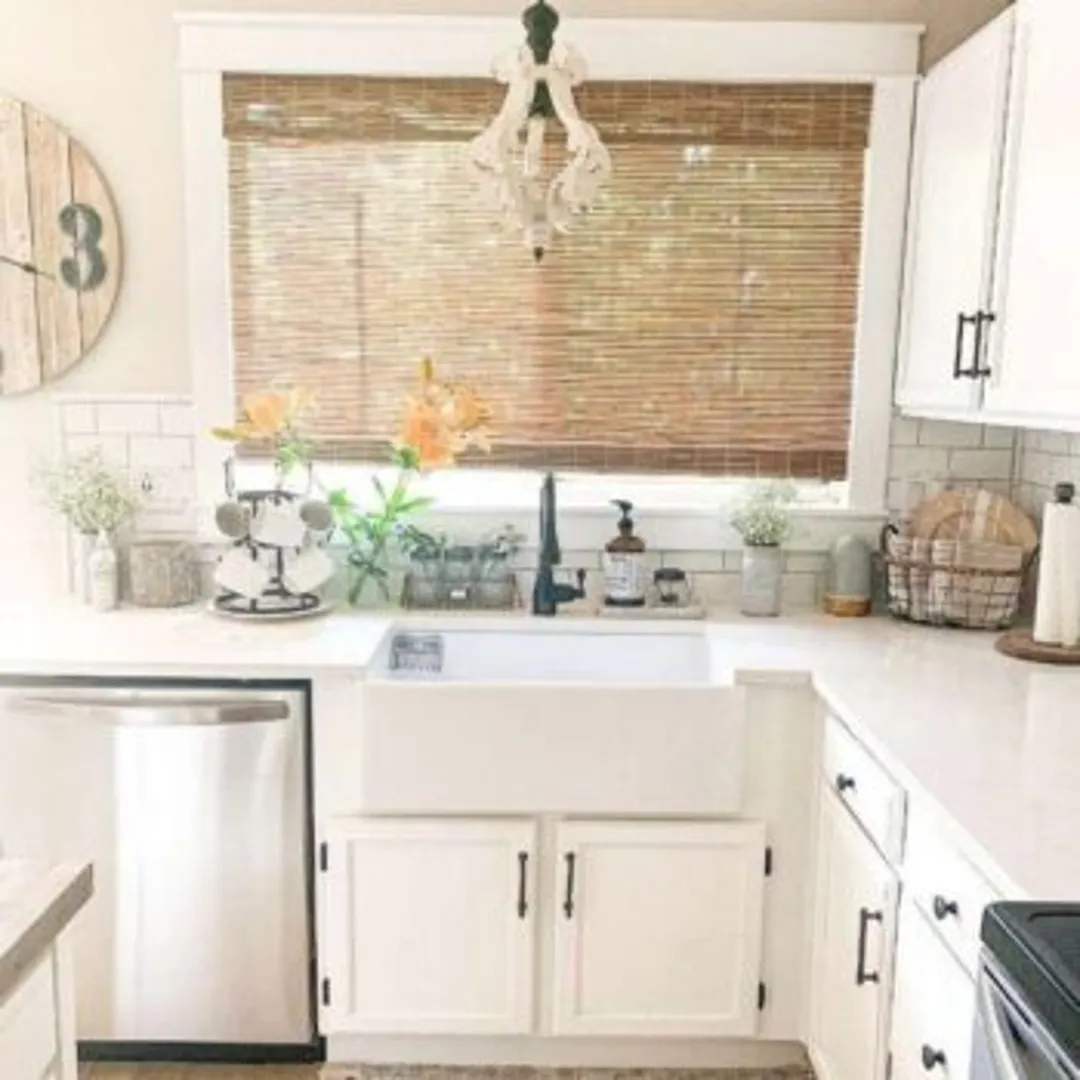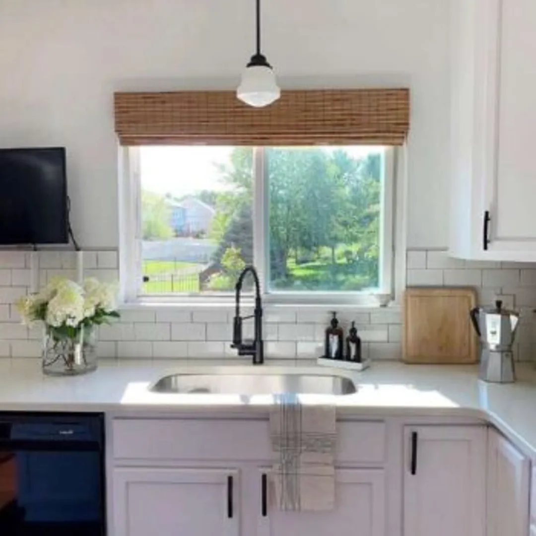 Плетеные бамбуковые жалюзи вписываются в современный или фермерский интерьер кухни, не отвлекая внимания от других элементов дизайна. К тому же они недорогие. Но если бамбук не подходит для вашей кухни в деревенском стиле, попробуйте вместо него римские шторы или роликовые из рогожи.