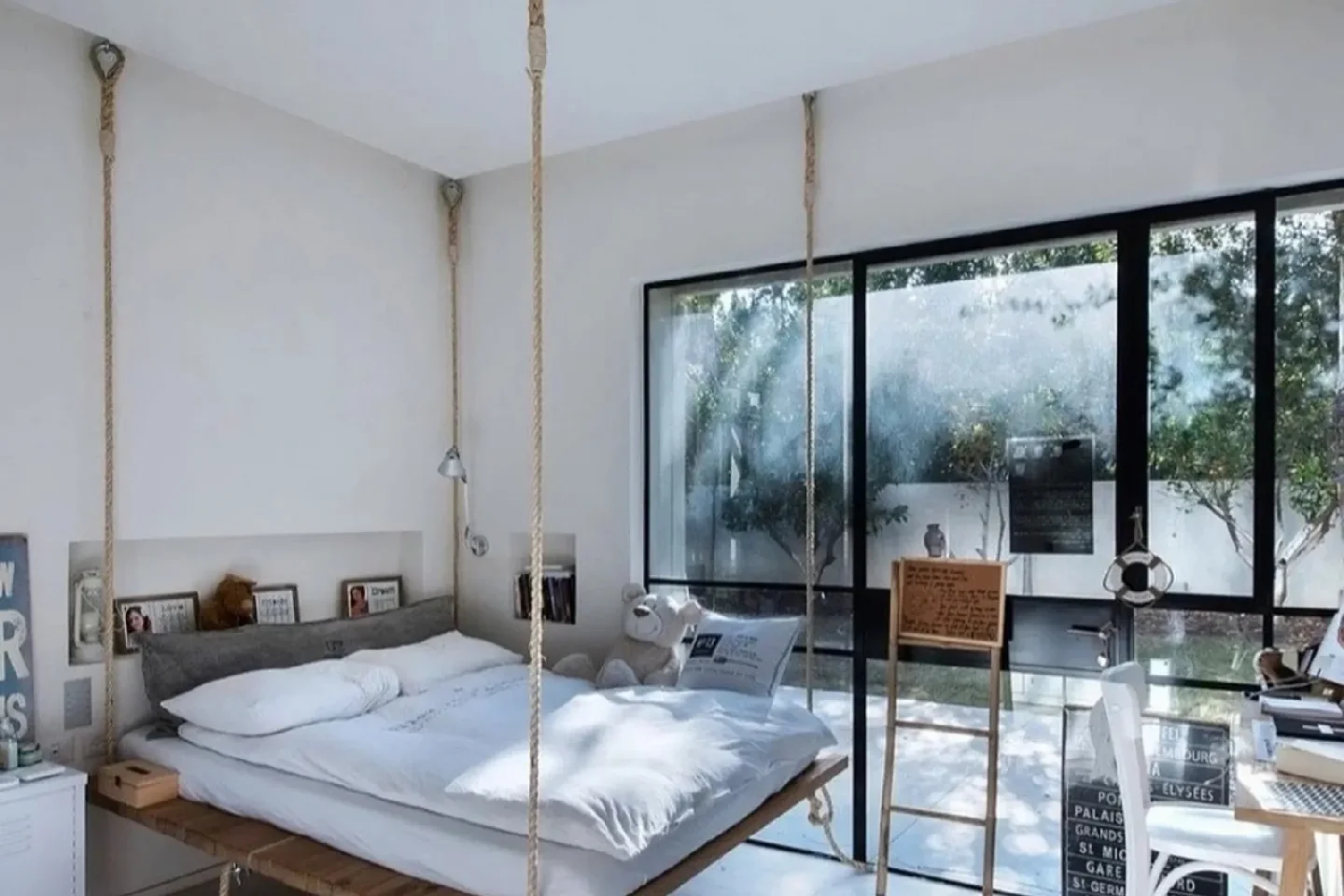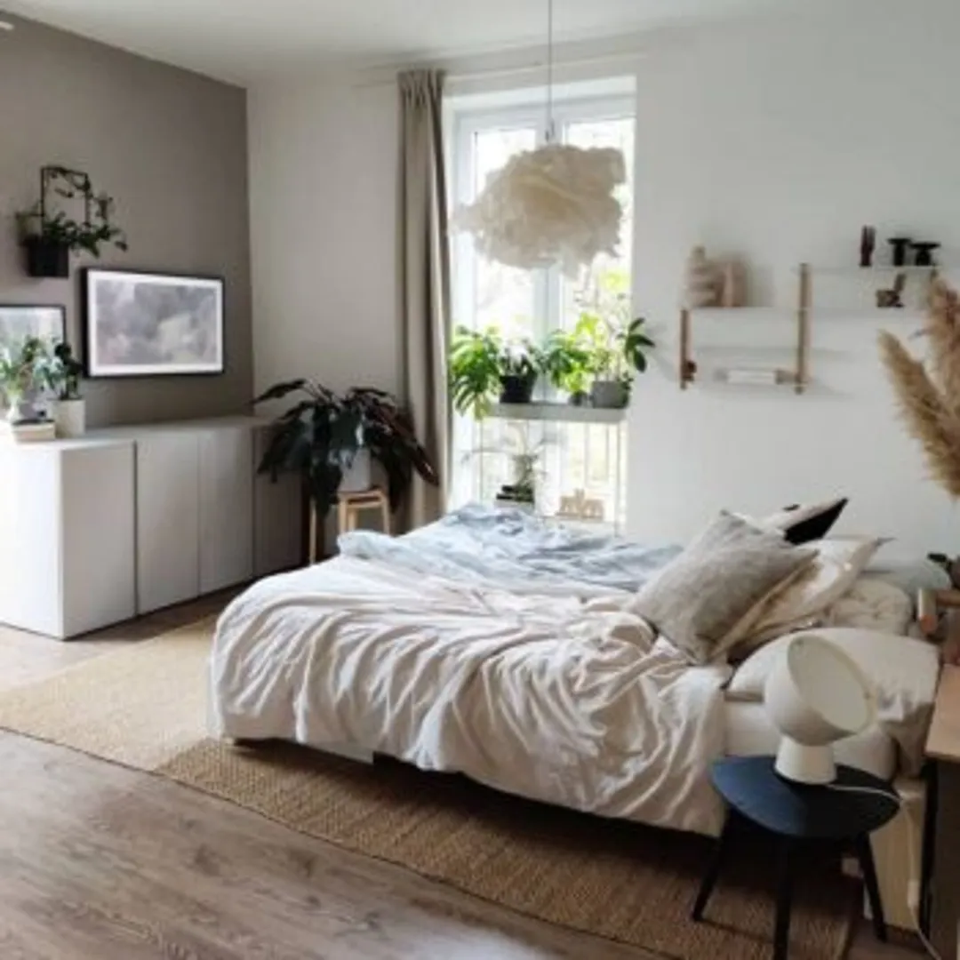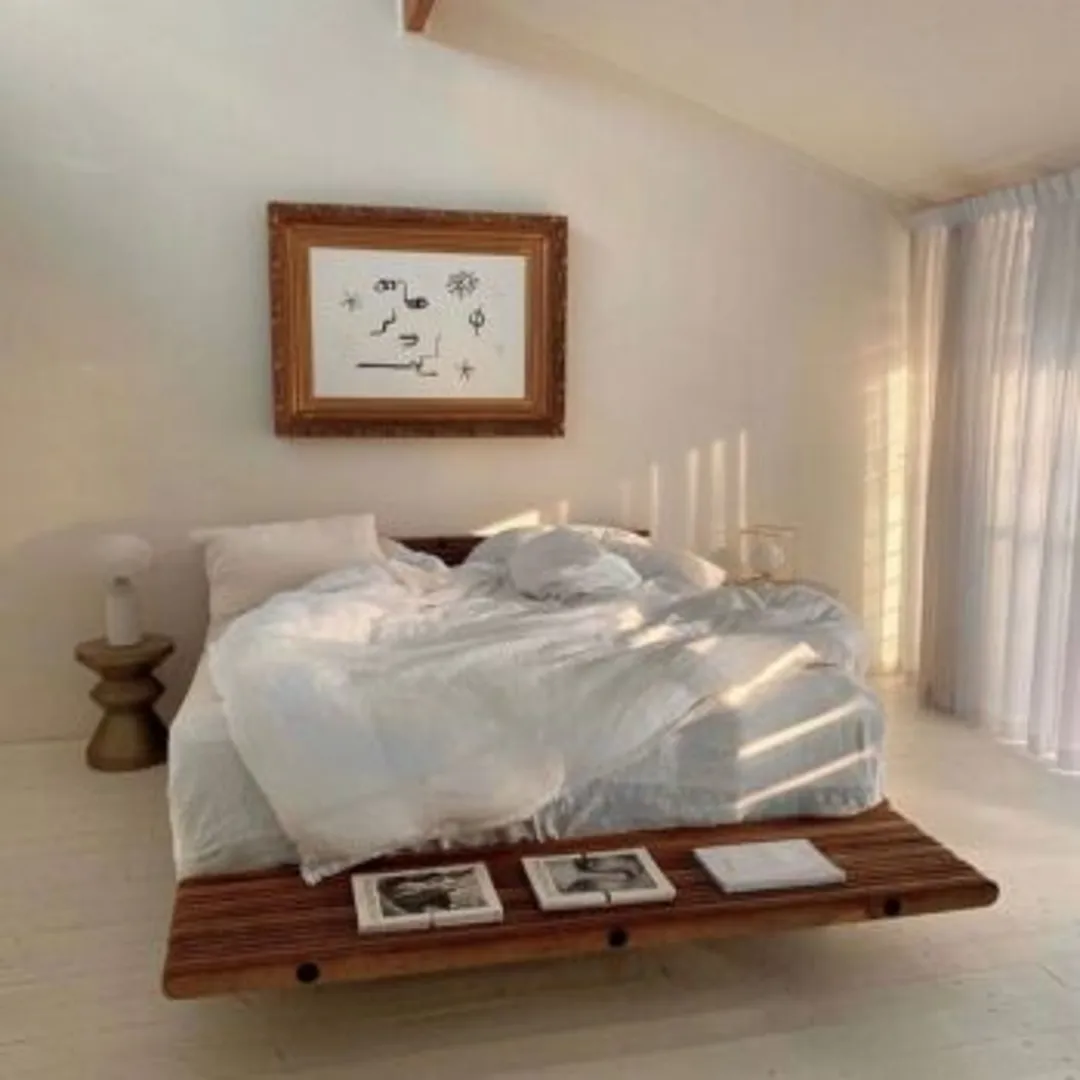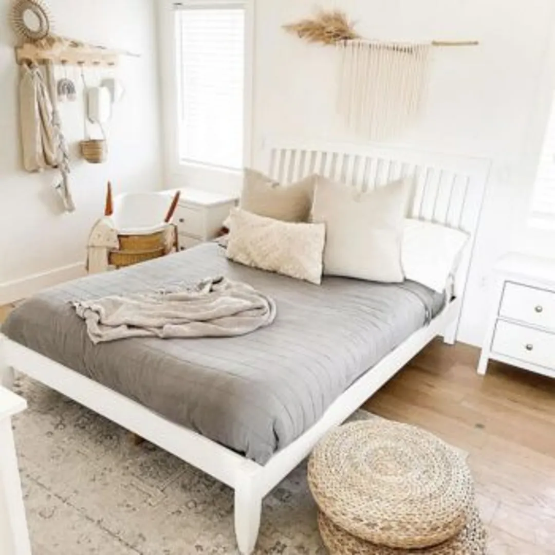 Начните с выбора невысокой кровати без громоздкого каркаса. Вы даже можете выбрать кровать на платформе, а затем сделать искусственное изголовье на стене над ней самостоятельно. Решите, как можно добавить в комнату пару растений для ощущения свежести и внесения естественного цвета.