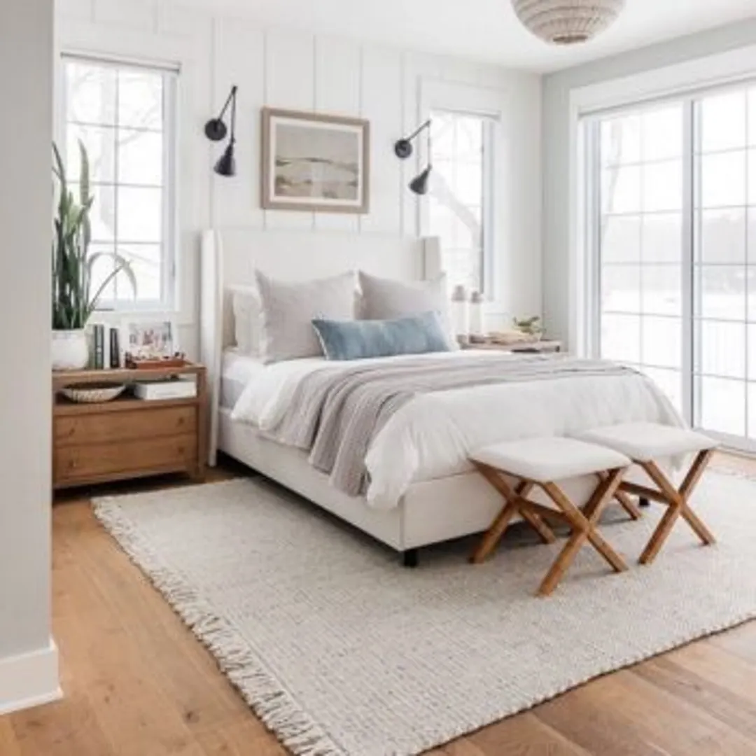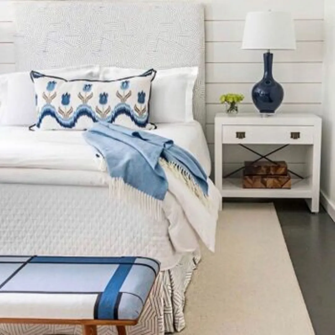 Еще один красивый образ, который вы можете создать, – это пляжный домик или морская тематика в вашей спальне. Используйте для отделки стен белую плиту и доведите ее до потолка. Завершите оформление, используя декоративную морскую отделку на мебели, настенном зеркале или других предметах интерьера.
